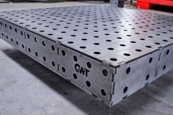 German Welding Tools 6 mm 2D Lochplatte. D28-15-1900 mm x 300mm – Lochraster 100×100. Mit GWT Linienraster und Winkelsignierung. Ecken mit Bohrungen für M16 Senkkopfschrauben für GWT Lochtischbeine.