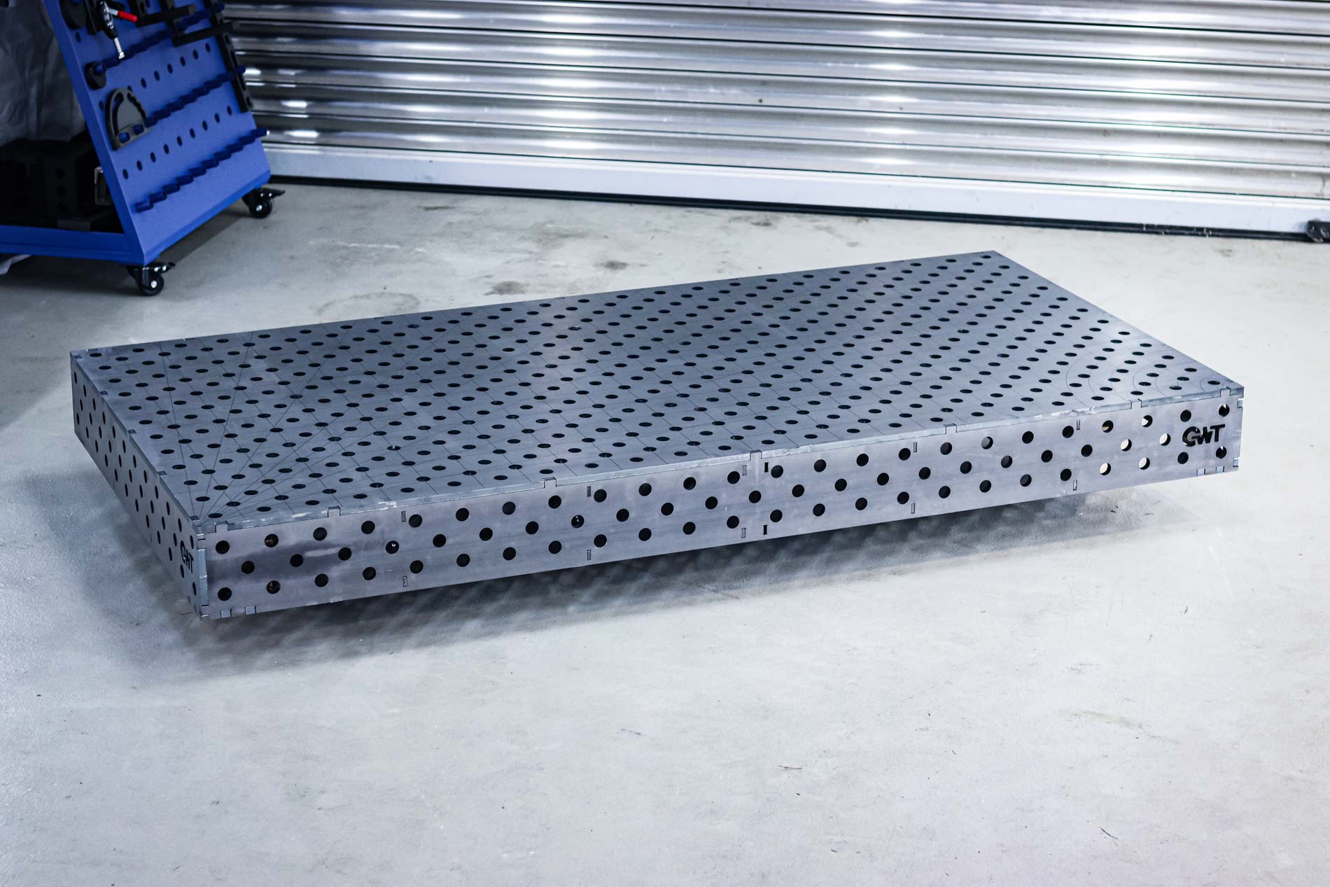 Der Basis German Welding Tools Schweißtisch im System D28 2950 x 1450 x 200 . Lochraster 100×100 mm mit 100×100 mm Gravurlinien. Zusätzlich befindet sich ein Loch im Diagonalraster auf den Gravurlinien.