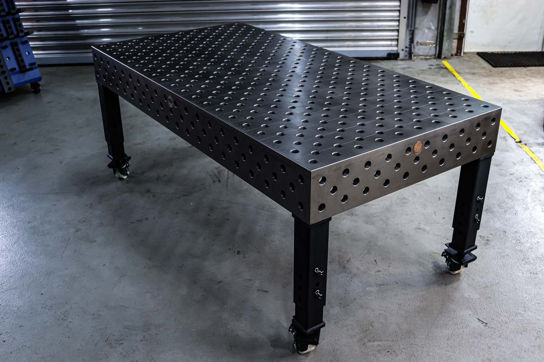Dein ulitmativer Heavy Duty 3D Schweißtisch mit Lochsystem D28 . Gefertigt aus Stahl S355JR. In den Abmaßen LxBxH: 1500x1000x200 . Lochraster 100x100mm mit Loch im Diagonalraster auf den Gravurlinien.