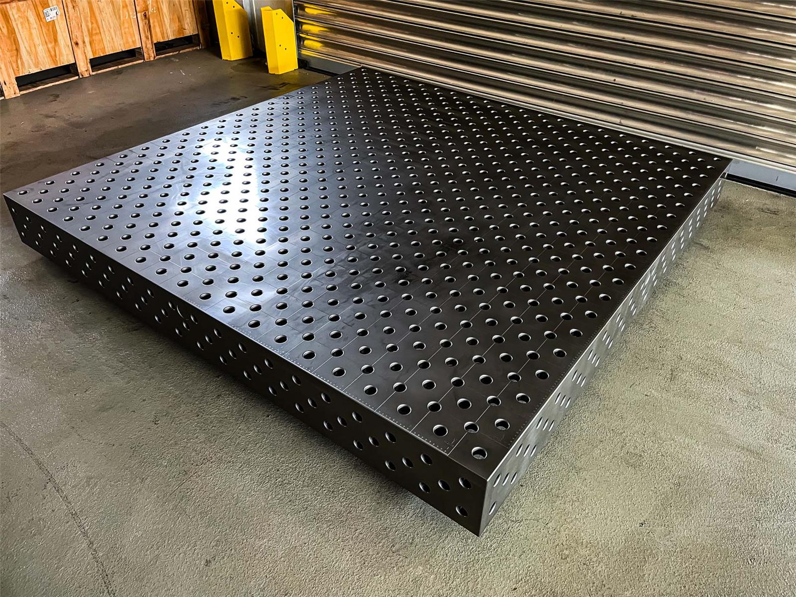 Dein ulitmativer Heavy Duty 3D Schweißtisch mit Lochsystem D28 . Gefertigt aus Stahl S355JR. In den Abmaßen LxBxH: 2000x2000x200 . Lochraster 100x100mm mit Loch im Diagonalraster auf den Gravurlinien.