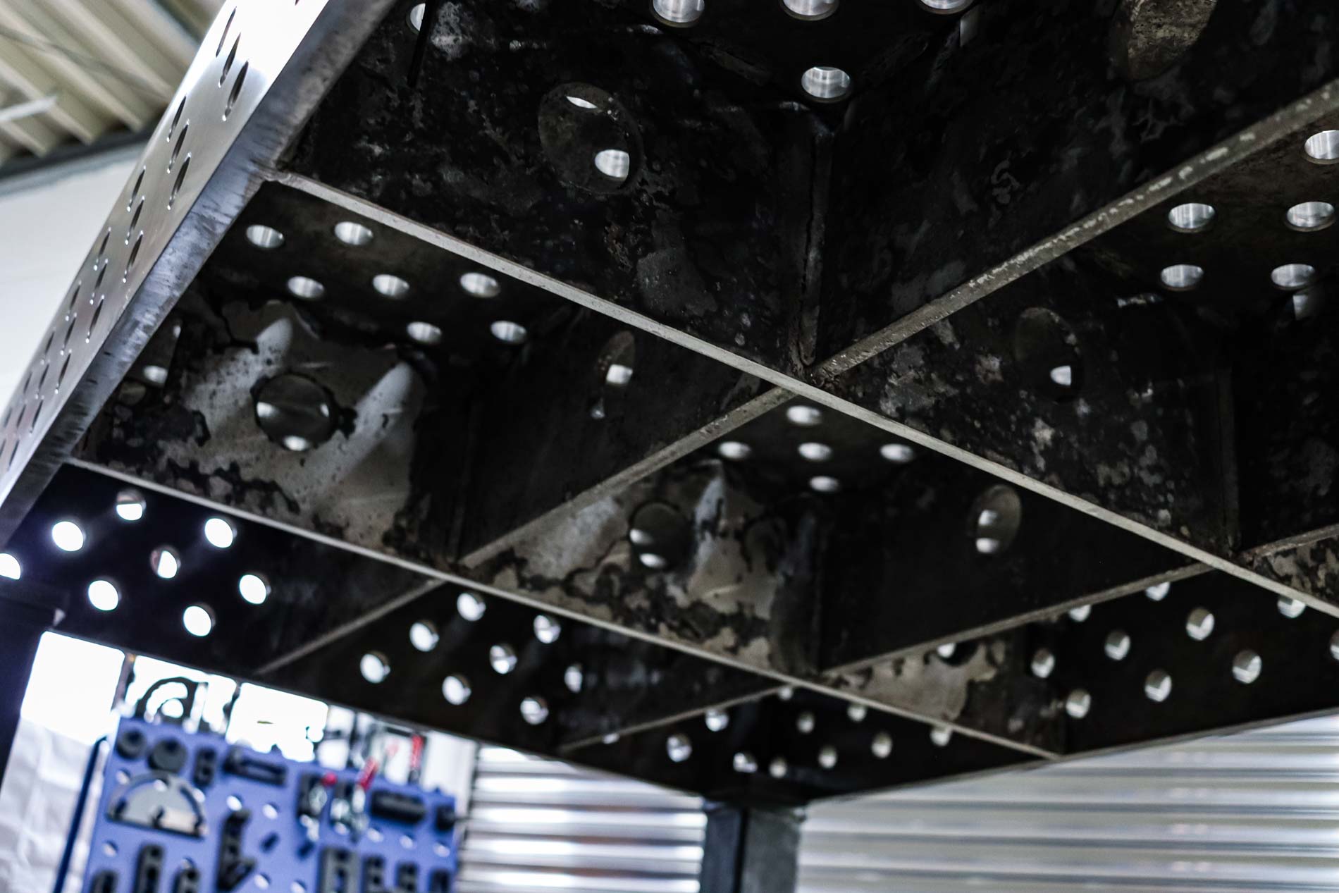 Dein ulitmativer Heavy Duty 3D Schweißtisch mit Lochsystem D28 – Werkzeugstahl 800M plasmanitriert – 1000x1000x200 . Lochraster 100x100mm mit Loch im Diagonalraster auf den Gravurlinien.