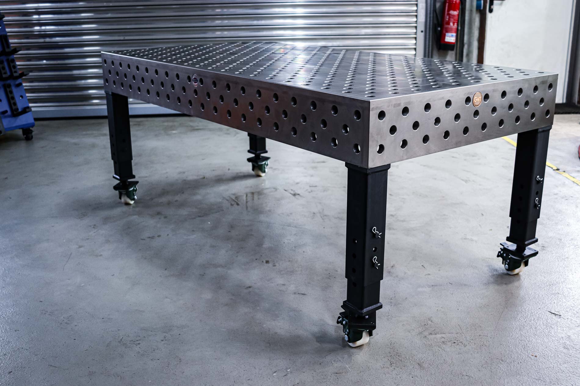 Dein ulitmativer Heavy Duty 3D Schweißtisch mit Lochsystem D28 – Werkzeugstahl 800M plasmanitriert – 1500x1000x200 . Lochraster 100x100mm mit Loch im Diagonalraster auf den Gravurlinien.