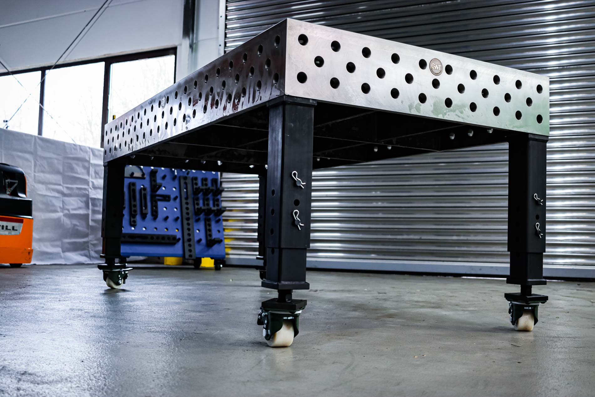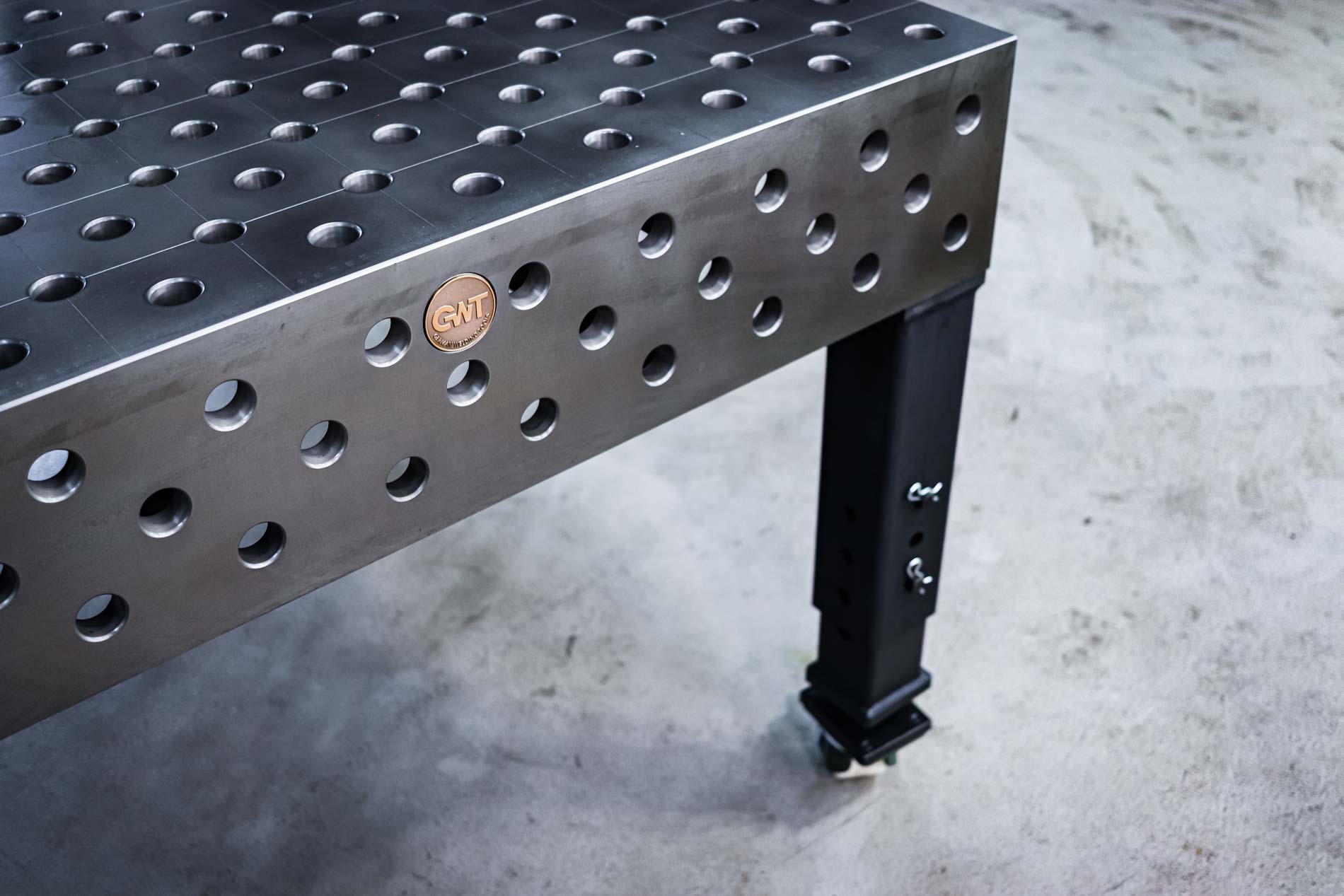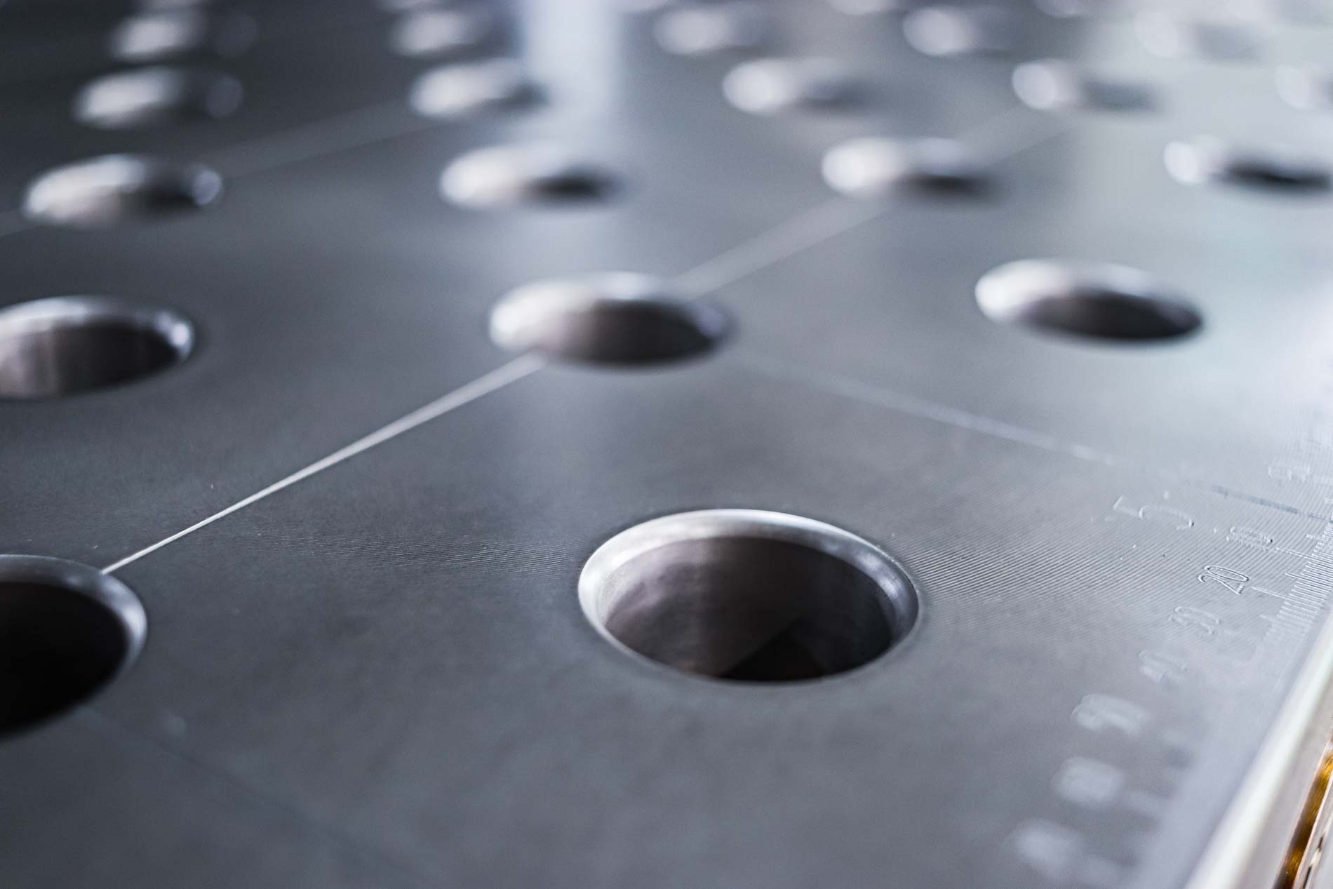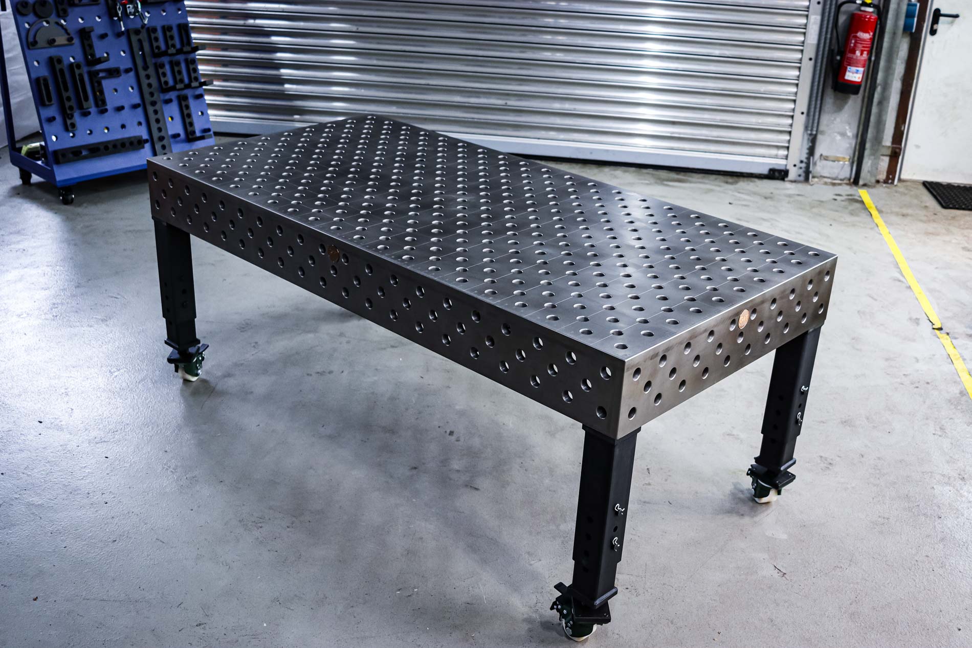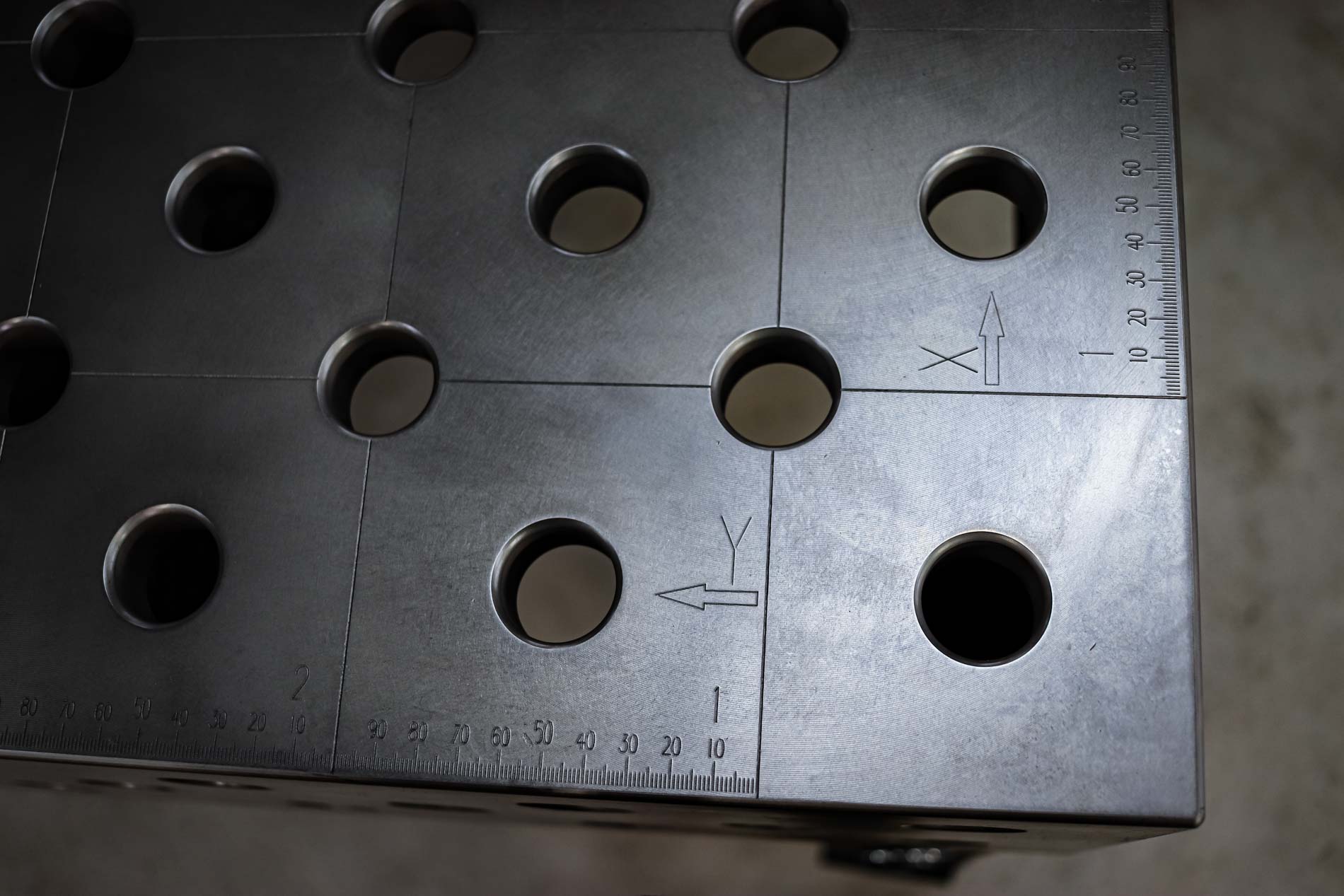 Dein ulitmativer Heavy Duty 3D Schweißtisch mit Lochsystem D28 – Werkzeugstahl 800M plasmanitriert – 2000x2000x200 . Lochraster 100x100mm mit Loch im Diagonalraster auf den Gravurlinien.