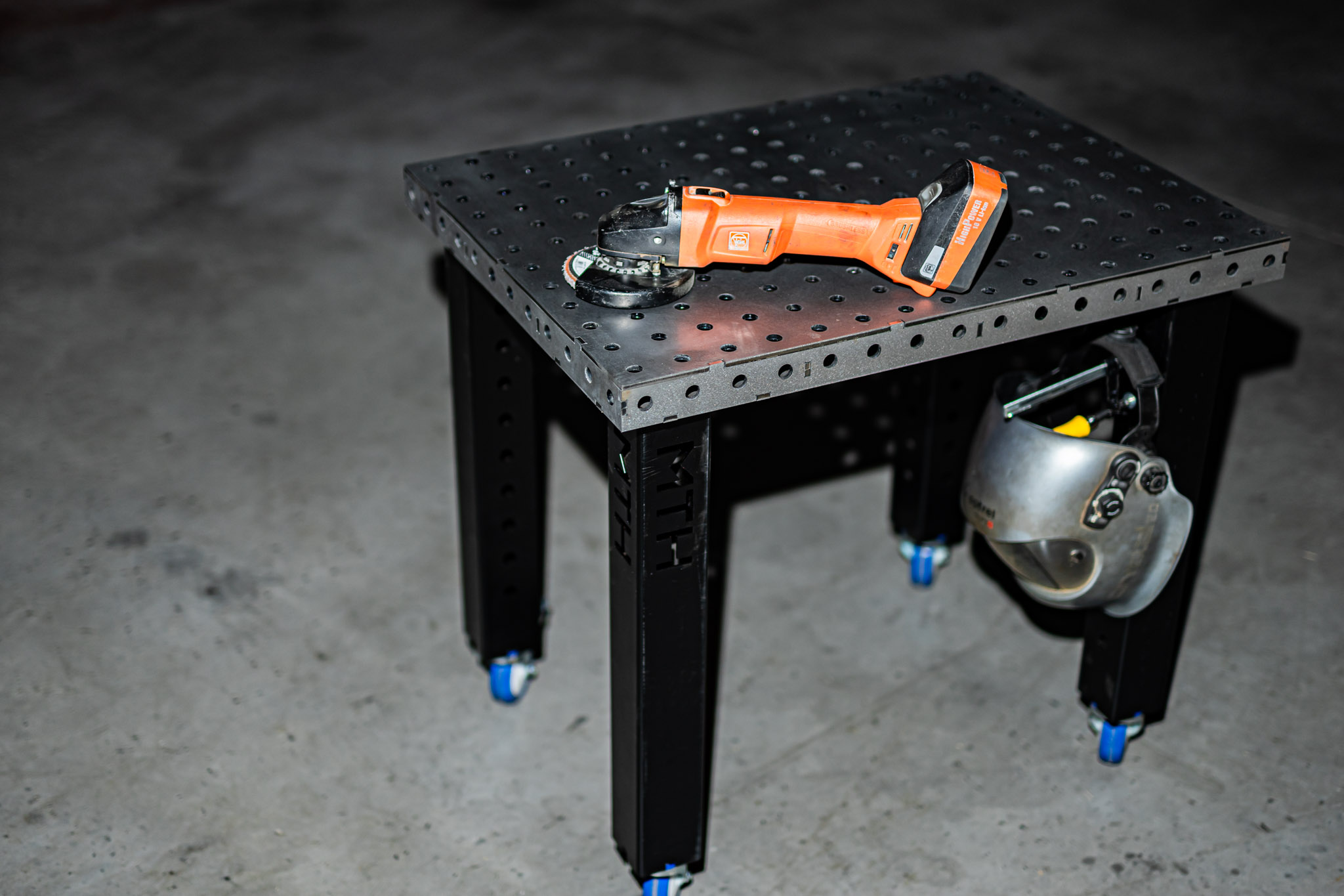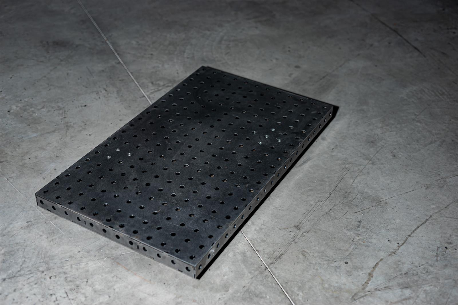 Mit dem Schweißtisch kannst Du deine Bauteile so fixieren, dass du Verzug beim Schweißen minimieren kannst. An den Seiten ab 150 mm Höhe ist das Lochraster in der mittleren Reihe versetzt angeordnet. Der Schweißtisch ist stark belastbar, bis zu circa 250 Kilogramm Punktlast hält er aus. Bitte beachtet die Tragfähigkeit der Beine und Rollen die Ihr darunter schraubt.