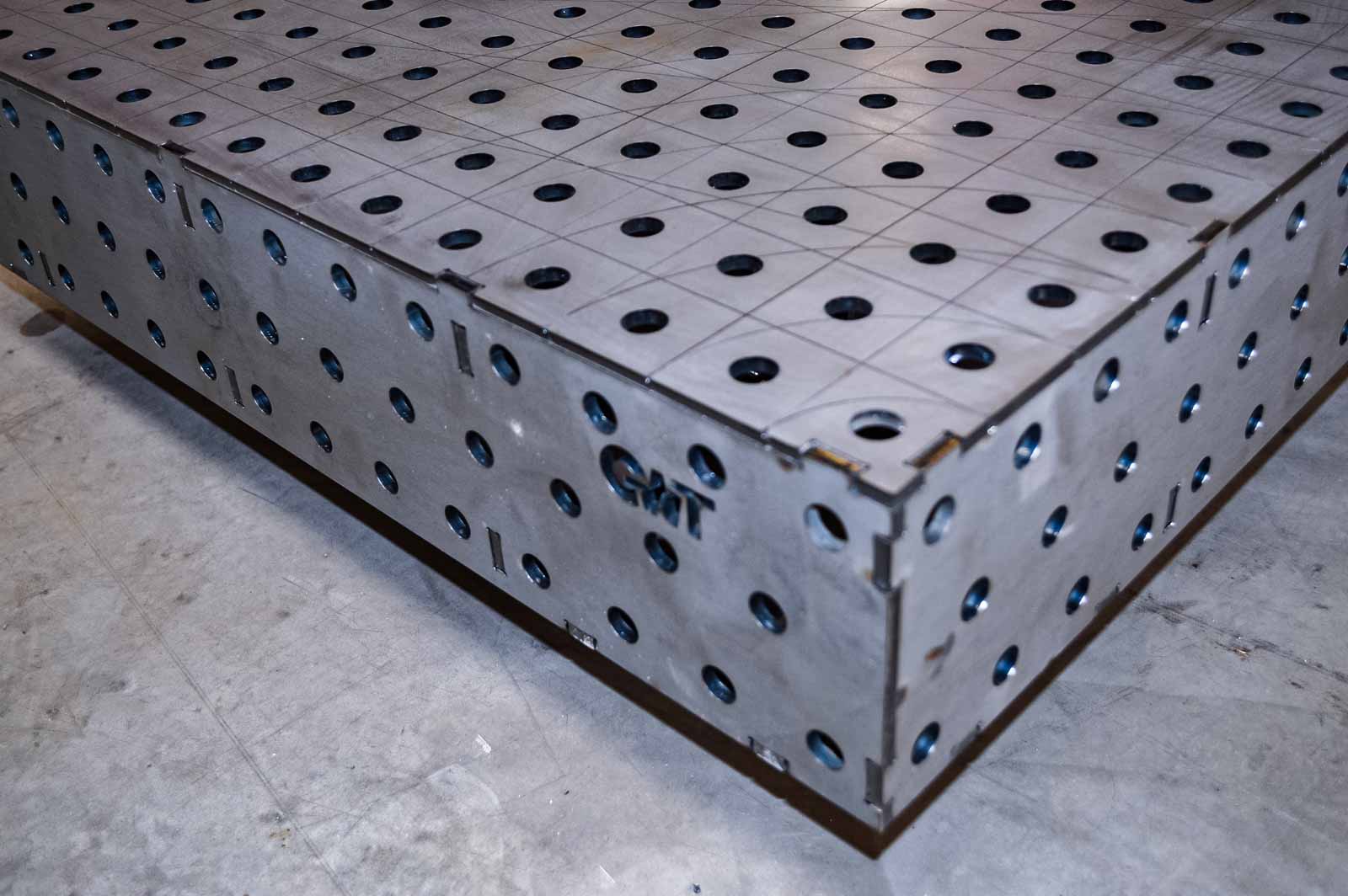 Mit dem Schweißtisch kannst Du deine Bauteile so fixieren, dass du Verzug beim Schweißen minimieren kannst. An den Seiten ab 150 mm Höhe ist das Lochraster in der mittleren Reihe versetzt angeordnet. Der Schweißtisch ist stark belastbar, bis zu circa 250 Kilogramm Punktlast hält er aus. Bitte beachtet die Tragfähigkeit der Beine und Rollen die Ihr darunter schraubt.
