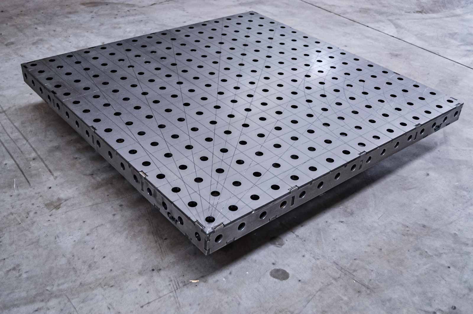 Mit dem Schweißtisch kannst Du deine Bauteile so fixieren, dass du Verzug beim Schweißen minimieren kannst. An den Seiten ab 150 mm Höhe ist das Lochraster in der mittleren Reihe versetzt angeordnet. Der Schweißtisch ist stark belastbar, bis zu circa 250 Kilogramm Punktlast hält er aus. Bitte beachtet die Tragfähigkeit der Beine und Rollen die Ihr darunter schraubt.