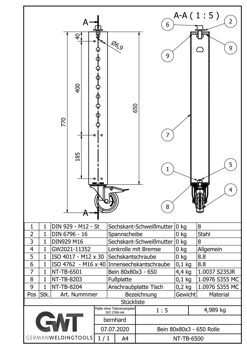 D16-6 Bein 80x80x3 – 650 Rolle (4x) geschweißt