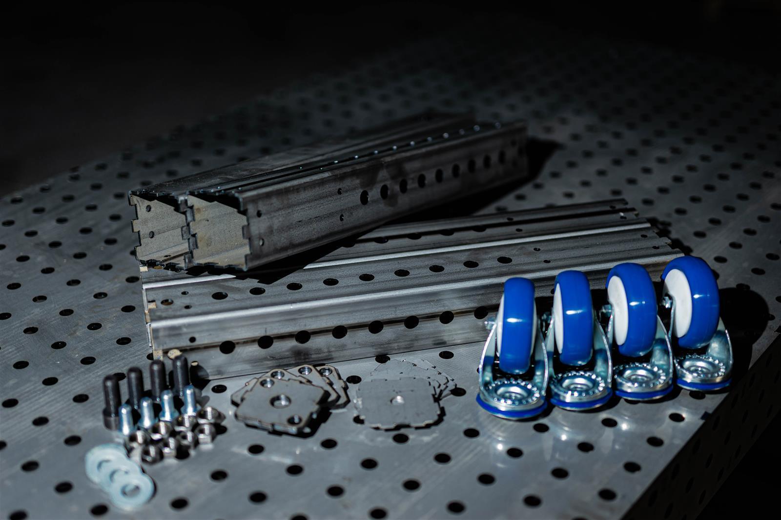 4 Stück Tischbeine aus 80x80x3 Quadratrohr. Innenliegende Bohrungen ermöglichen das verstauen von Spannzwingen und Zubehör. Waagrecht positionierte Bohrungen geben euch die Möglichkeit Zwischenböden/Fächer einzuschrauben. Die Beine sind beidseitig mit Gewinde ausgestattet, oben Ma16 unten M12 und somit für Rollen oder Maschinenfüße geeignet.