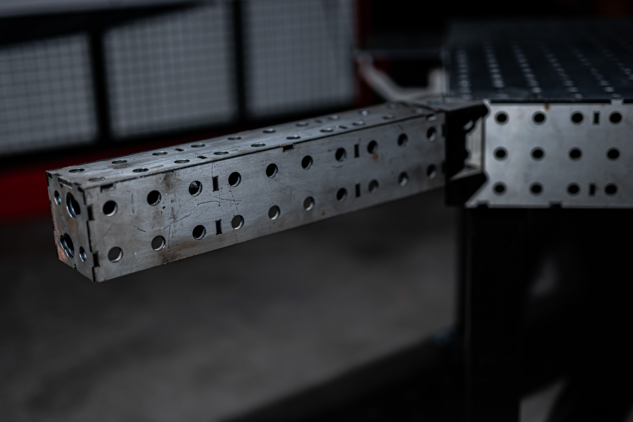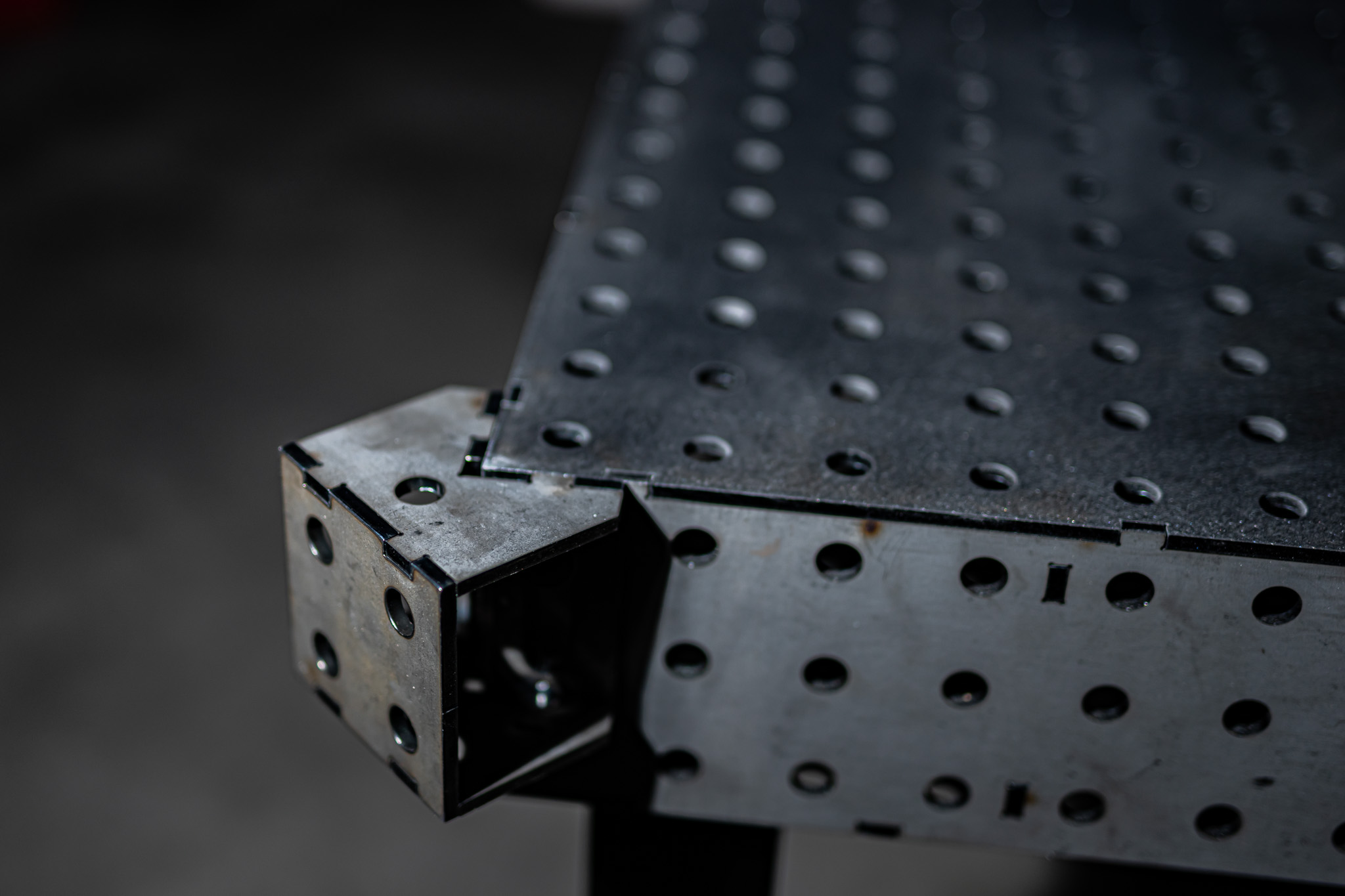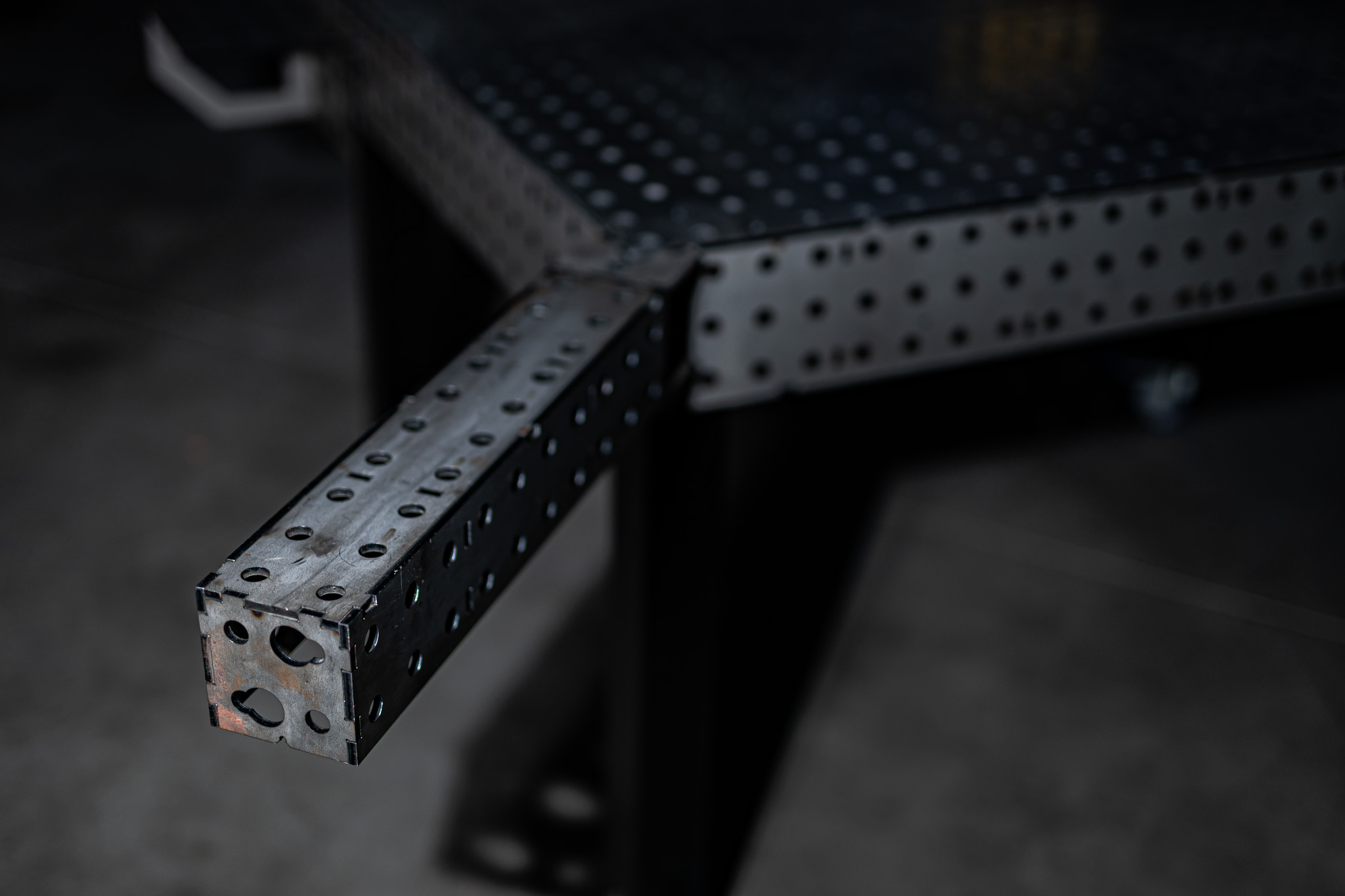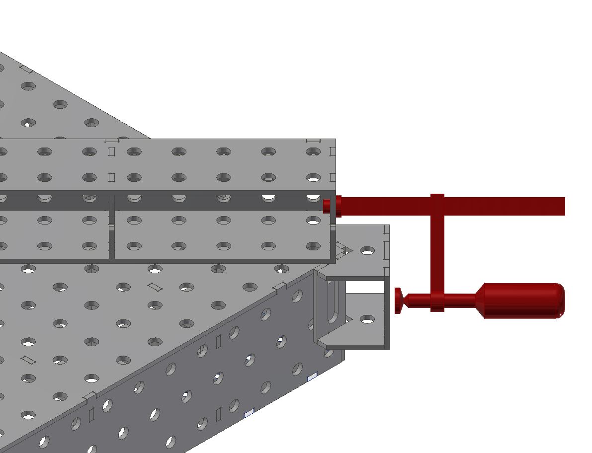 Setze deine Spannblöcke genau auf die Ecke deines Schweißtisches im 45° Winkel. Erweitere den Schweißtisch für große Konstruktionen oder arbeite neben dem Tisch um Dein Bauteil drum herum.