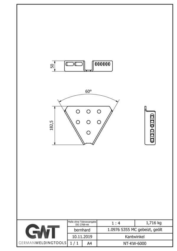 Der GWT Kantwinkel lässt sich vielfältig einsetzen: Ausgestattet mit einem einfachen Design, schafft der Kantwinkel doch Großes. hiermit kannst Du beispielsweise innen und außen Werkstücke spannen. Wenn Du mehrere Kantwinkel benutzt um einen Rahmen zu bauen kannst Du die Diagonalen mit der Anlagefläche messen, um die Rechtwinkligkeit zu prüfen. Dabei hat der Kantwinkel eine Winkelgenauigkeit von ± 0,5°. Bei der Schenkellänge beträgt die Toleranz ± 0,2 mm. Ebenso wie die Schweißtische besitzt dieses Produkt ein Lochraster 50 x 50 mm mit einer Bohrung von Ø16 mm. Der Kantwinkel ist nicht entgratet.
