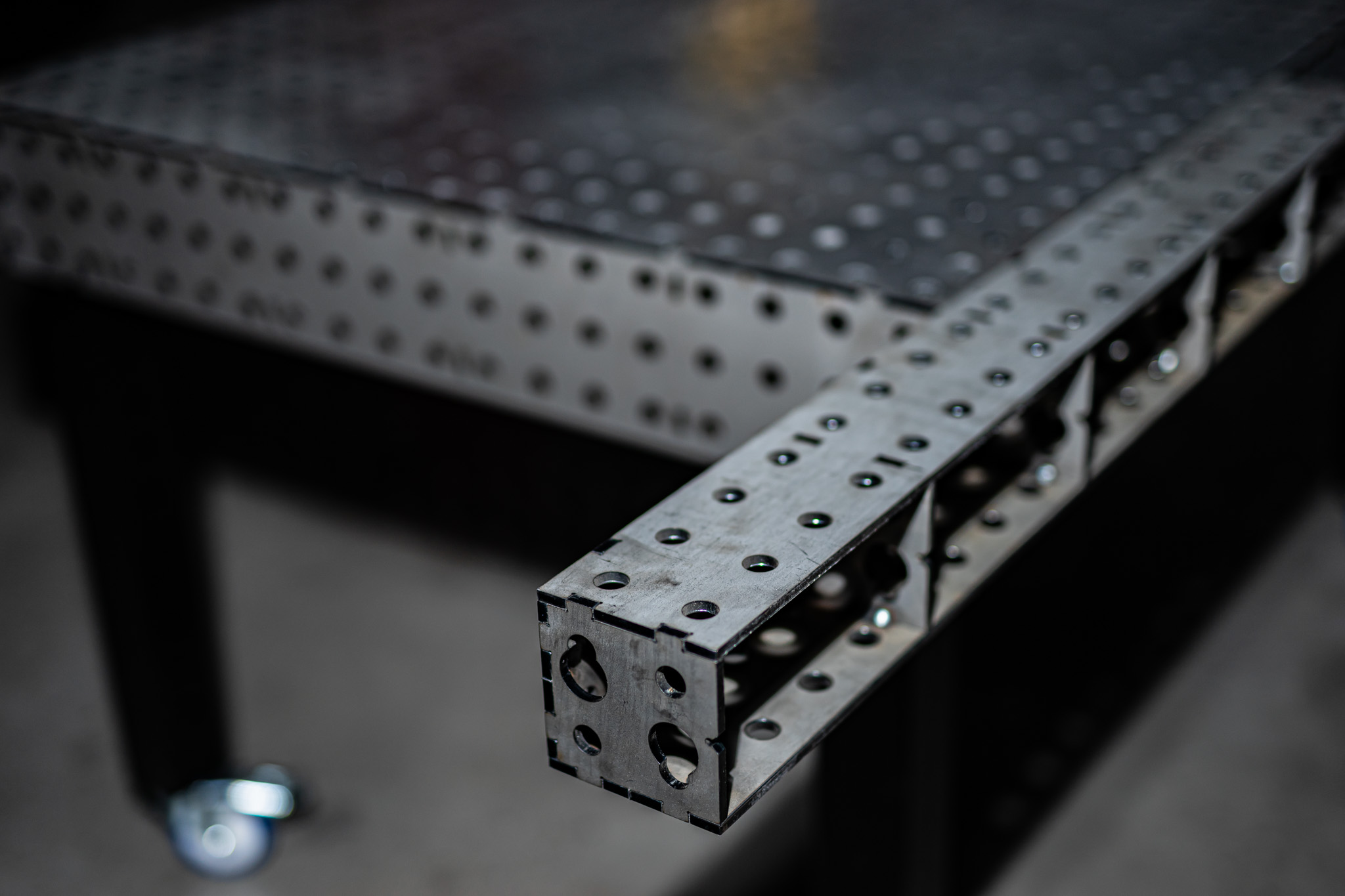 Die Racks haben neben dem Lochraster 50×50 mm noch Aussparungen, damit du diese über eine M16 Innensechskantschraube schieben kannst und so schnell und sicher deinen Schweißplatz einrichten kannst.