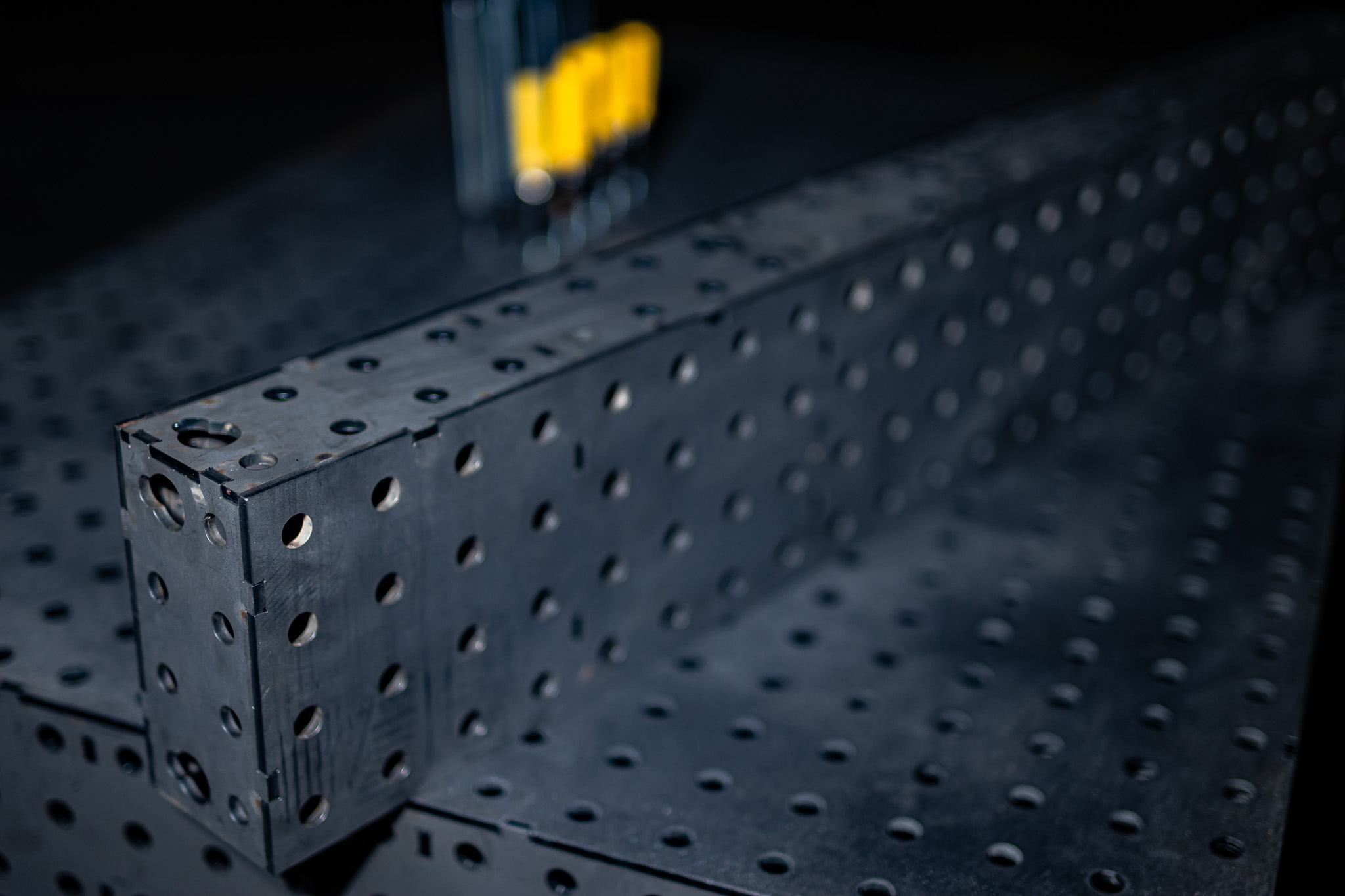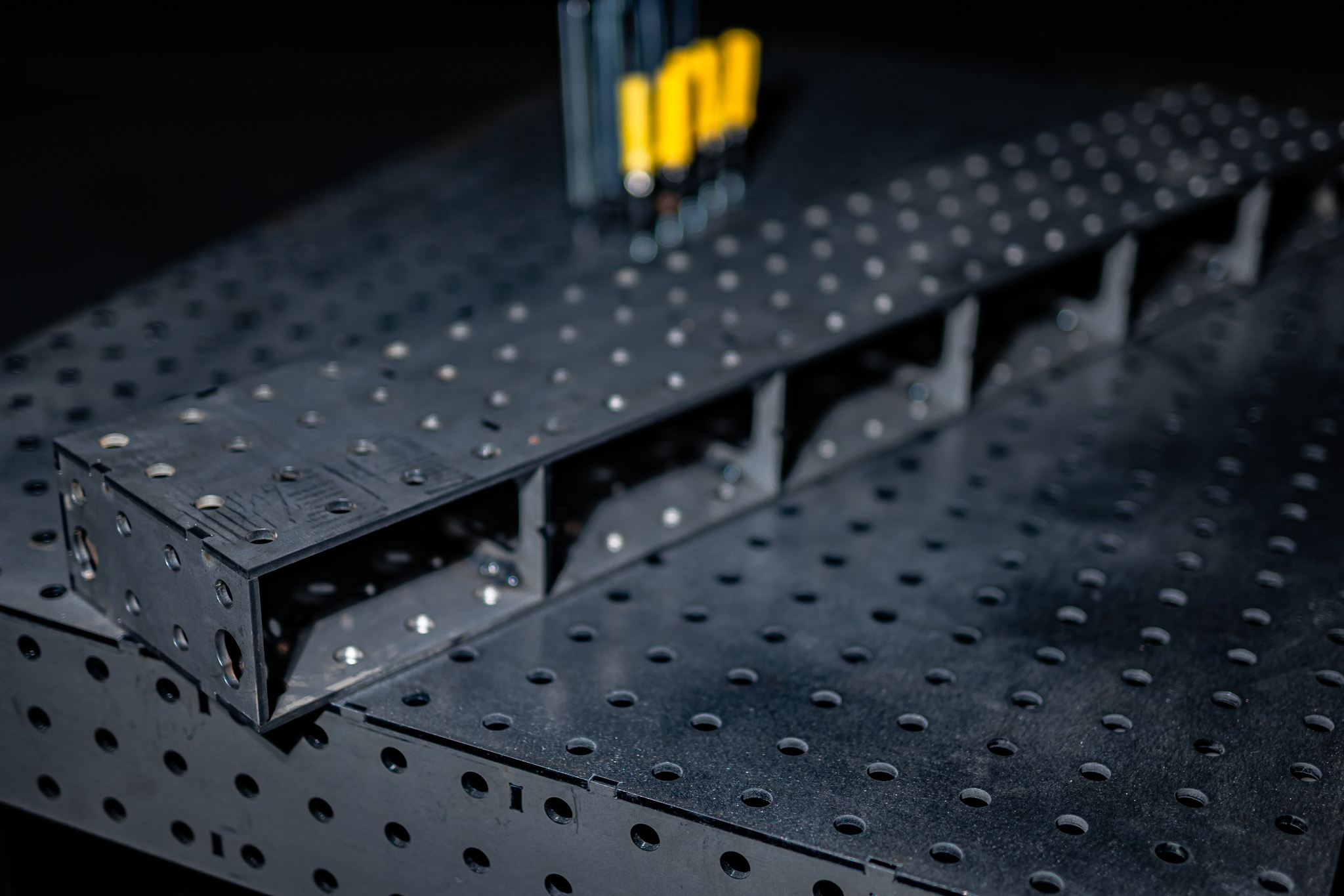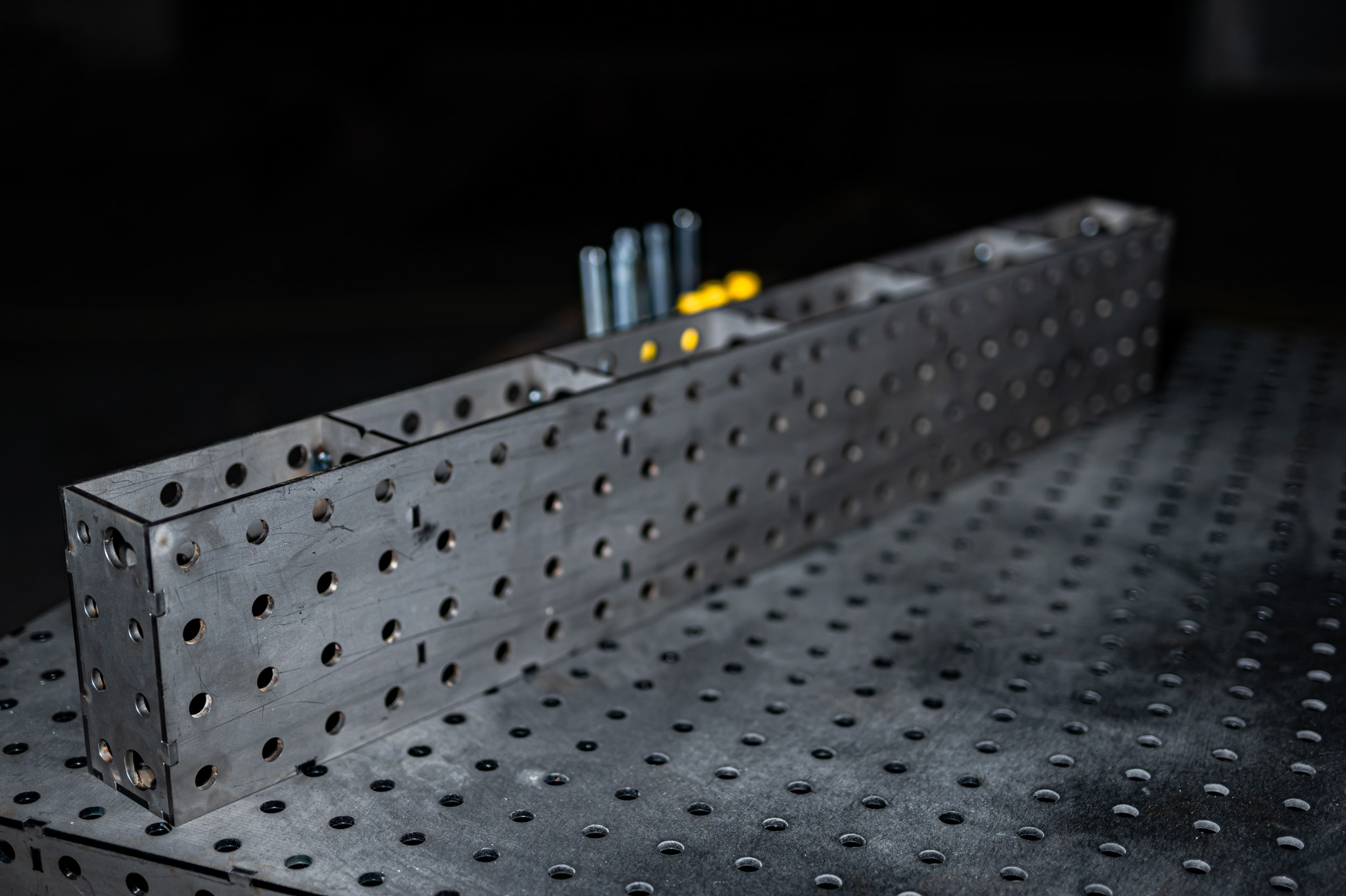 Die Racks haben neben dem Lochraster 50×50 mm noch Aussparungen, damit du diese über eine M16 Innensechskantschraube schieben kannst und so schnell und sicher deinen Schweißplatz einrichten kannst.