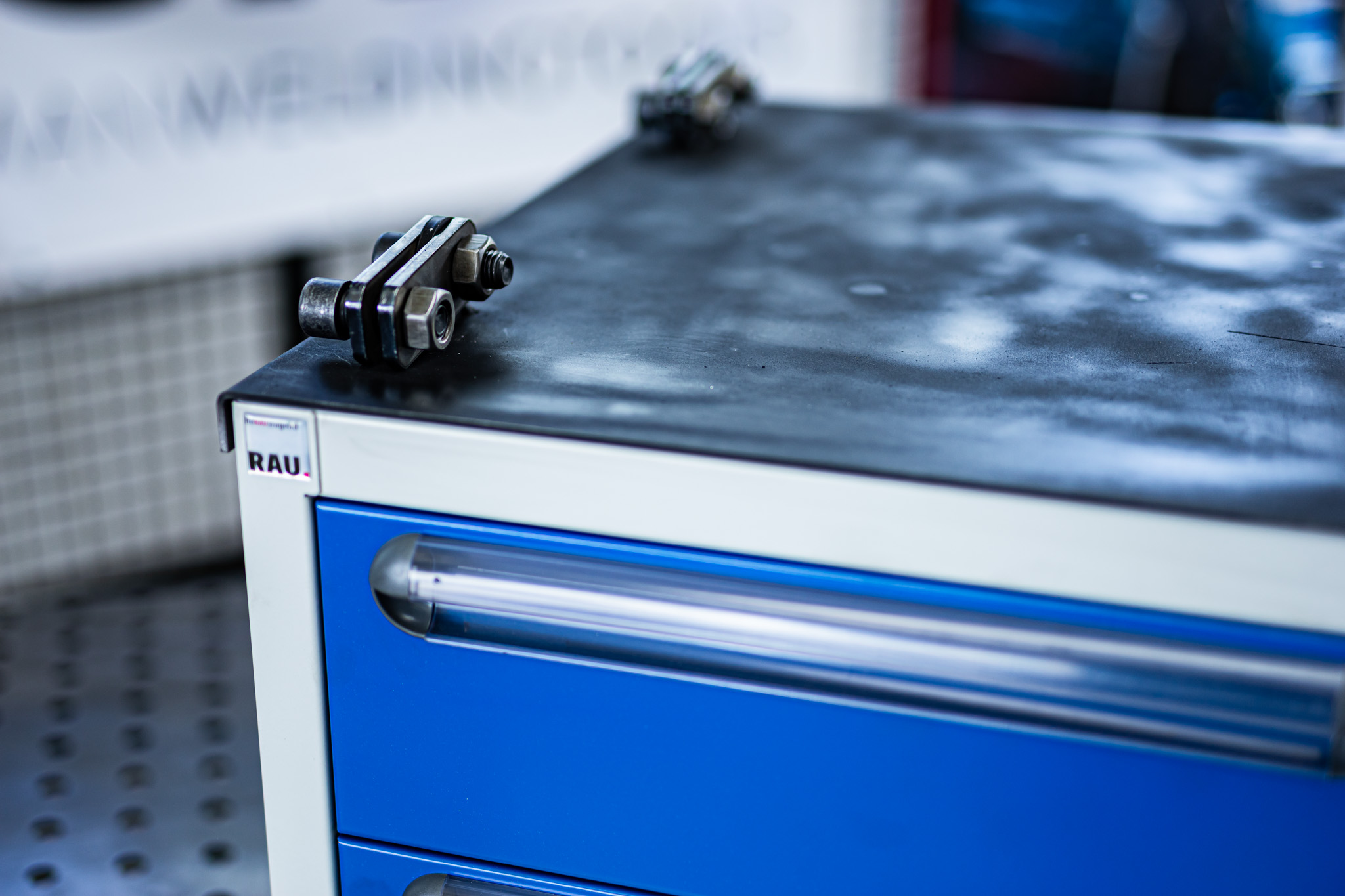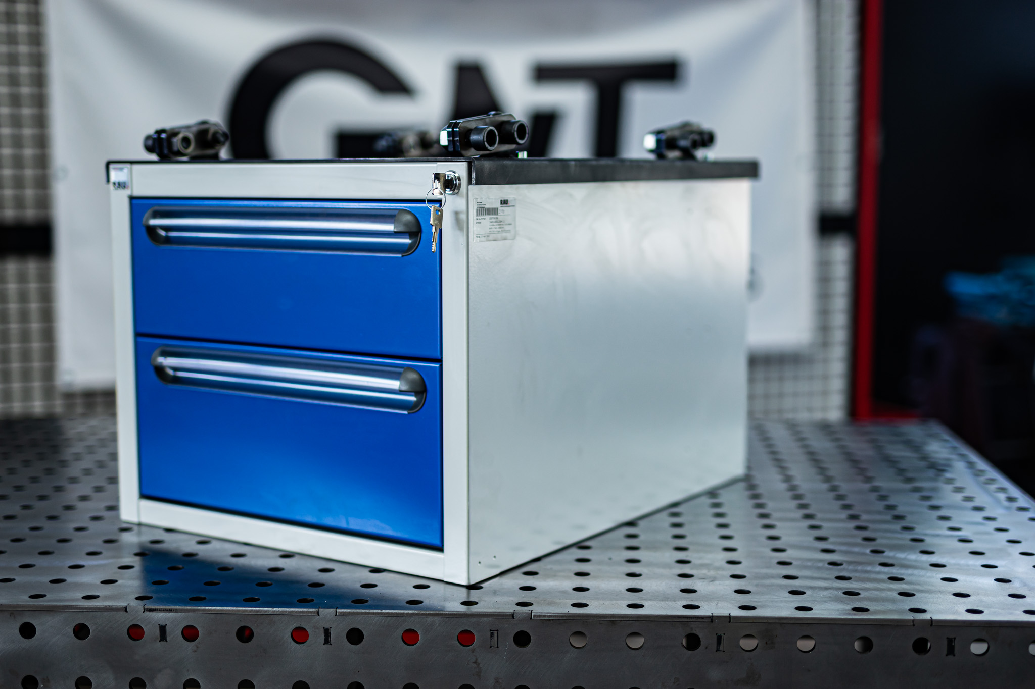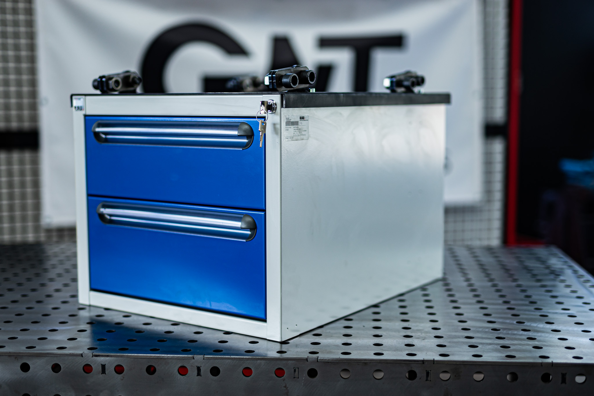 Original RAU Werkzeugschrank / Schubladen Ausführung mit GWT Aufnahmeblech als Bausatz. Passend unter die 6mm Bausatztische.