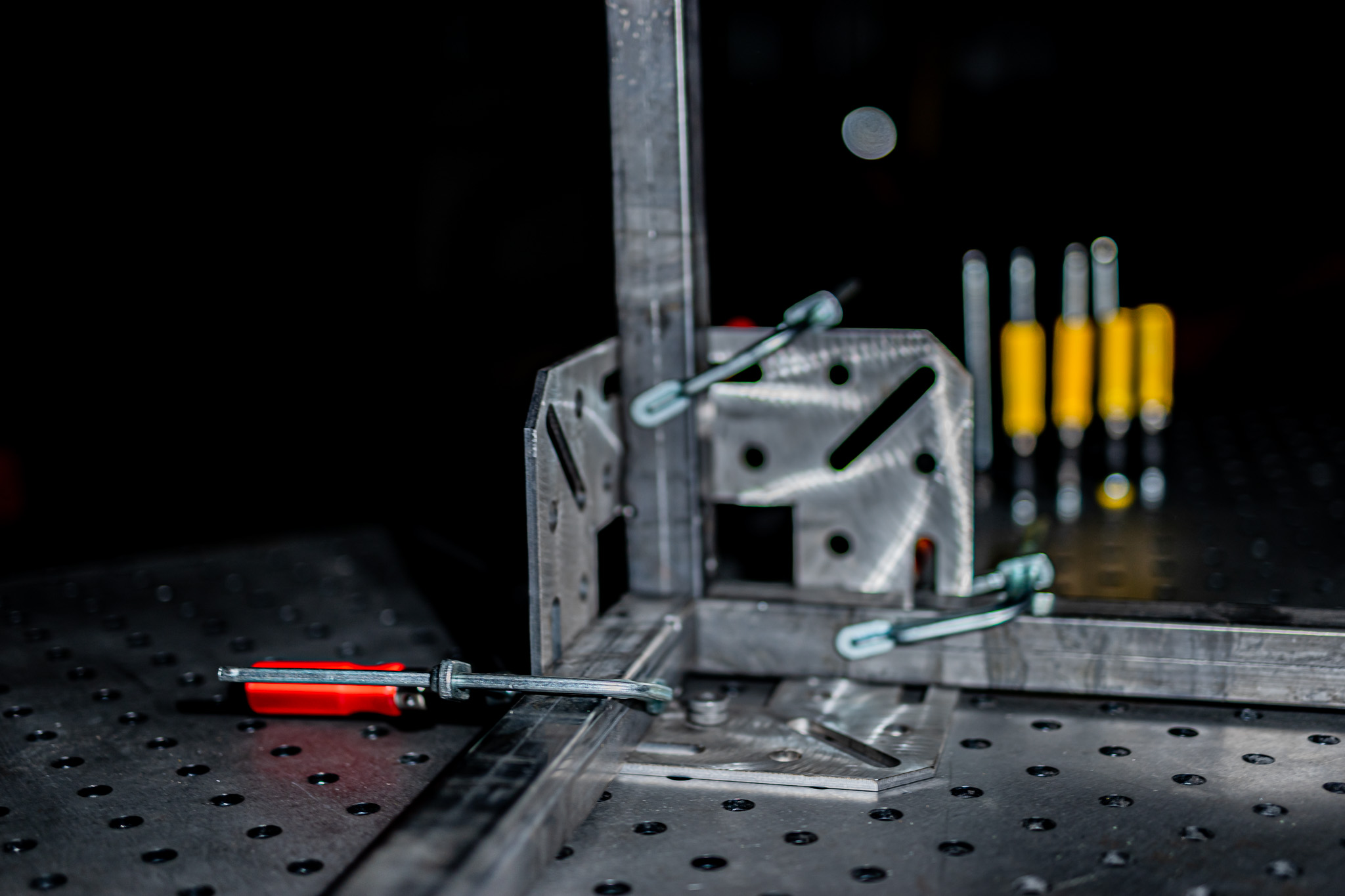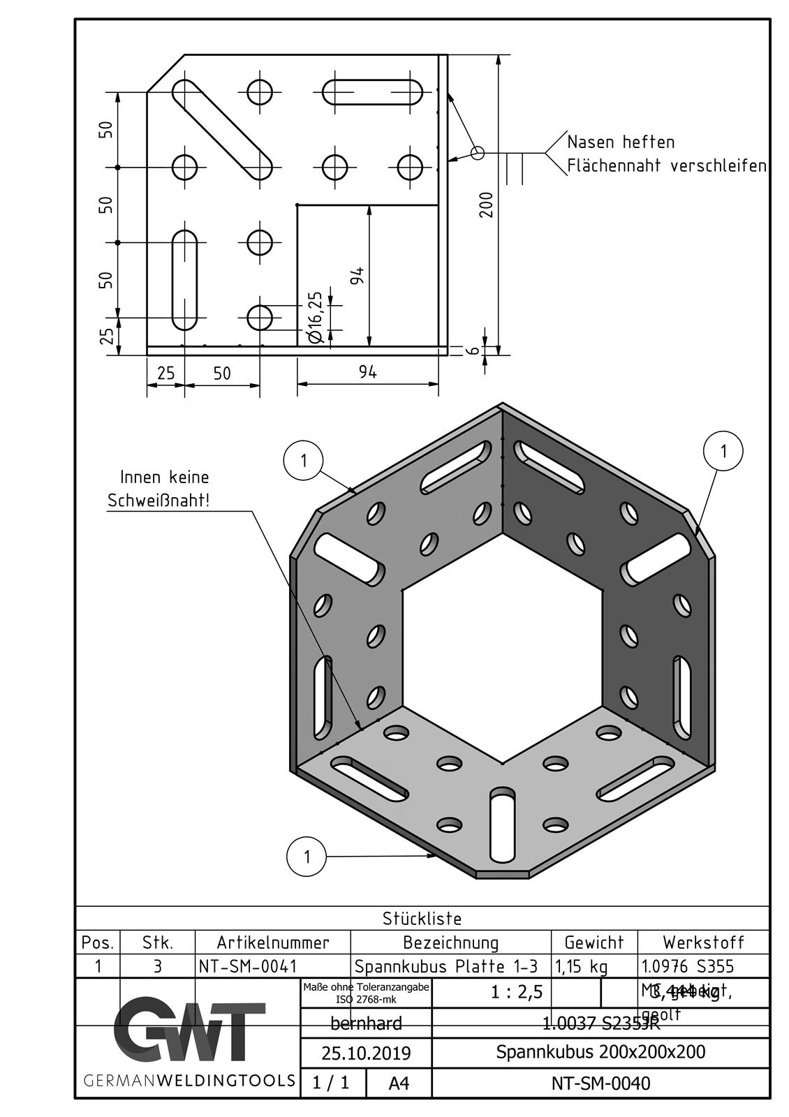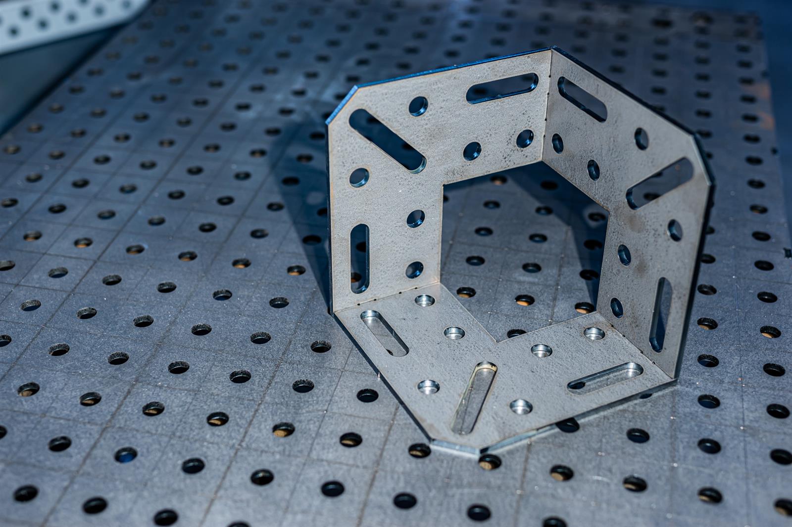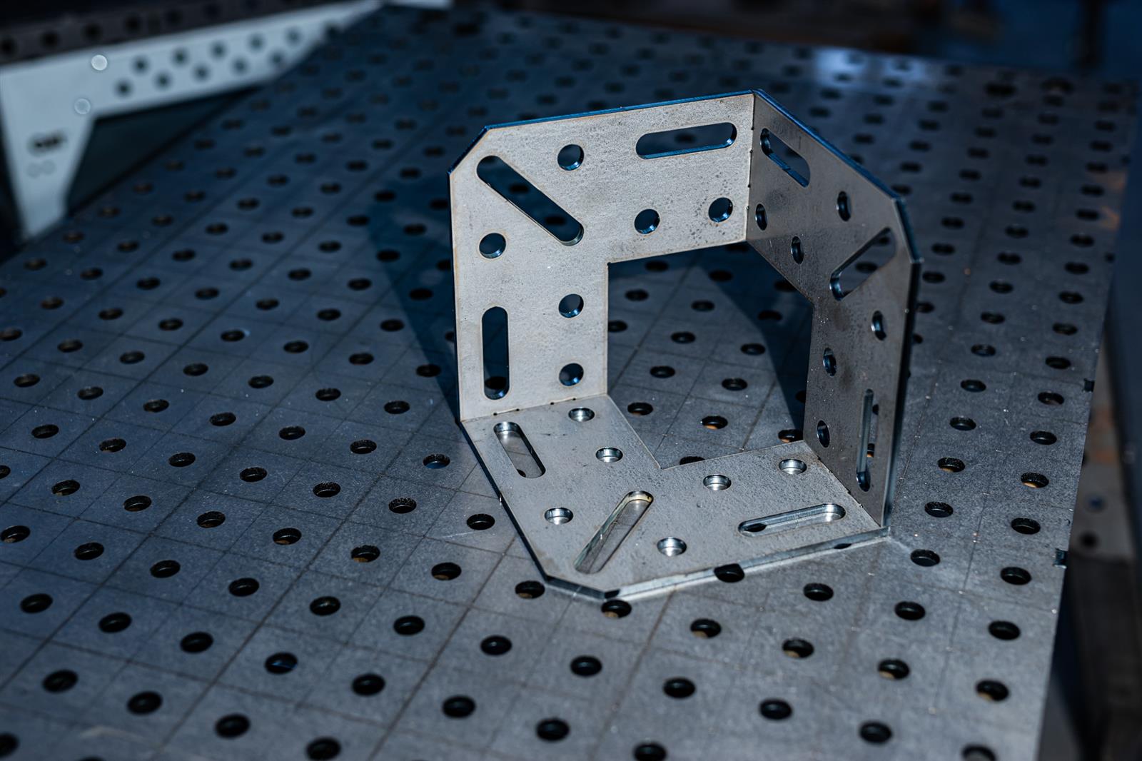 Der Spannkubus kommt zum Einsatz, wenn Dein Projekt in die dritte Dimension geht. Das bedeutet, wenn Du in die Höhe bauen möchtest, kannst Du deine Werkstücke mittels des Spannkubus sicher auf dem Schweißtisch als zweidimensionalen Rahmen fixieren und anschließend zum Beispiel die vertikalen Streben eines Regals positionieren und fixieren. Der Spannkubus ist so konzipiert, dass Du gleichzeitig von Innen und Außen genügend Platz für Deinen Schweißbrenner hast um von drei Seiten arbeiten zu können.