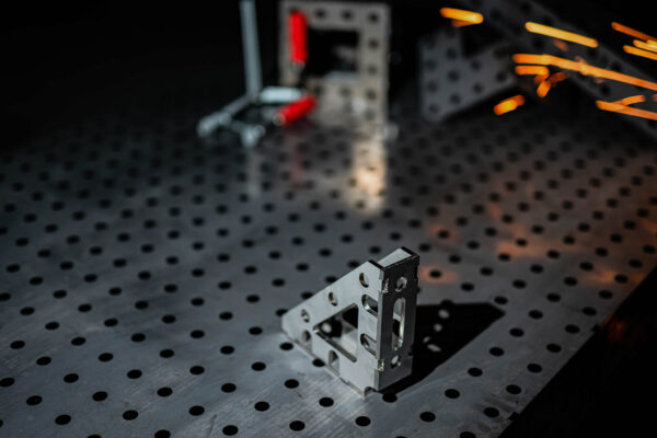 Spannwinkel aus Chromnickelstahl mit den Maßen 175x175x 50mm. Ein Schenkel mit System16 in Fixpositionen, der zweite mit Langloch zum Stufenlosen einstellen.