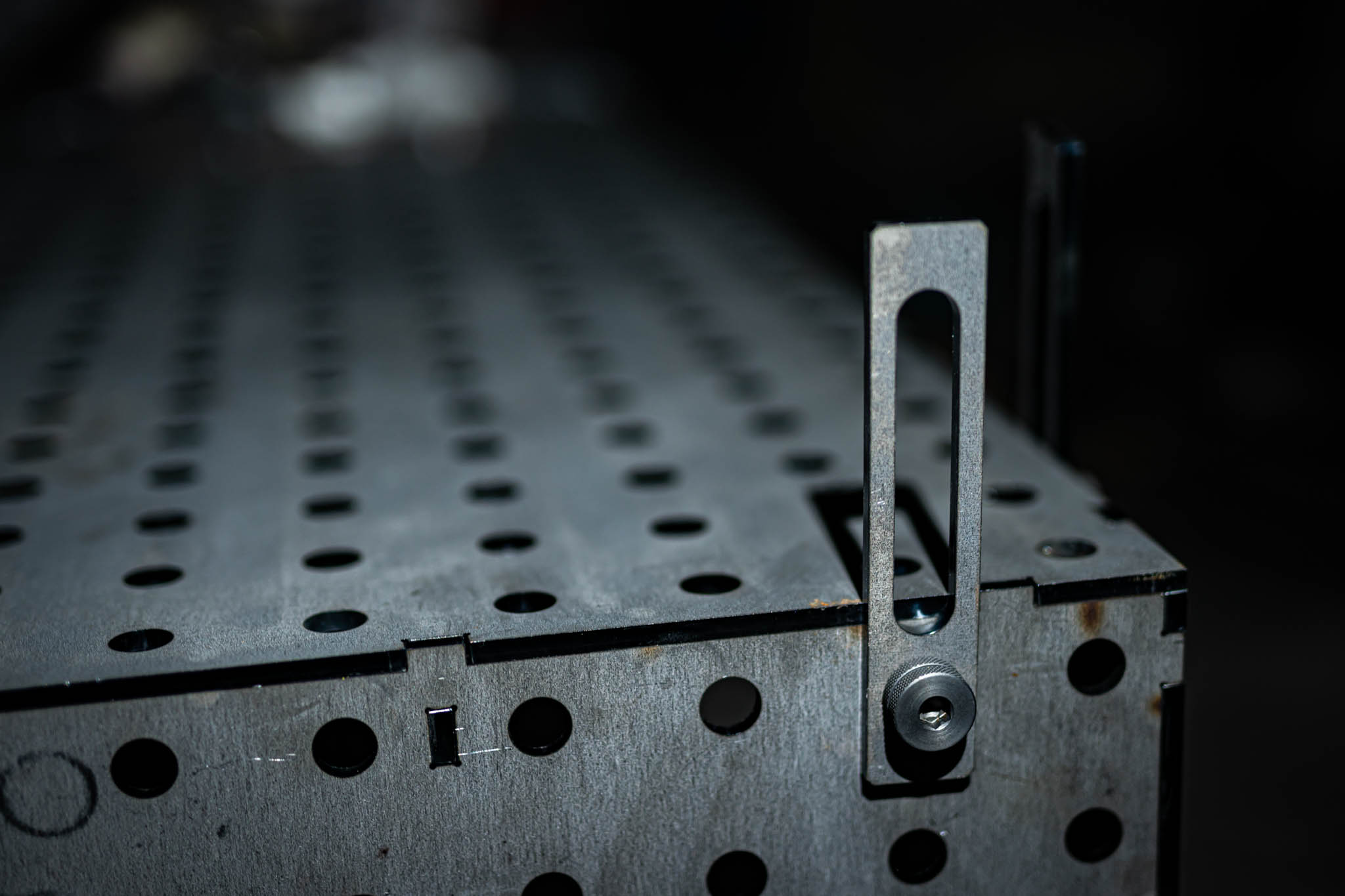 Mithilfe der Universalbefestigung lassen sich Elemente, die Du bearbeiten möchtest, leicht auf dem Schweißtisch positionieren. Als Anschlag für rechtwinklige Rahmen lässt sich dieses Spannelement an den Seiten des Tischs anbringen. So bist Du sofort einsatzbereit.