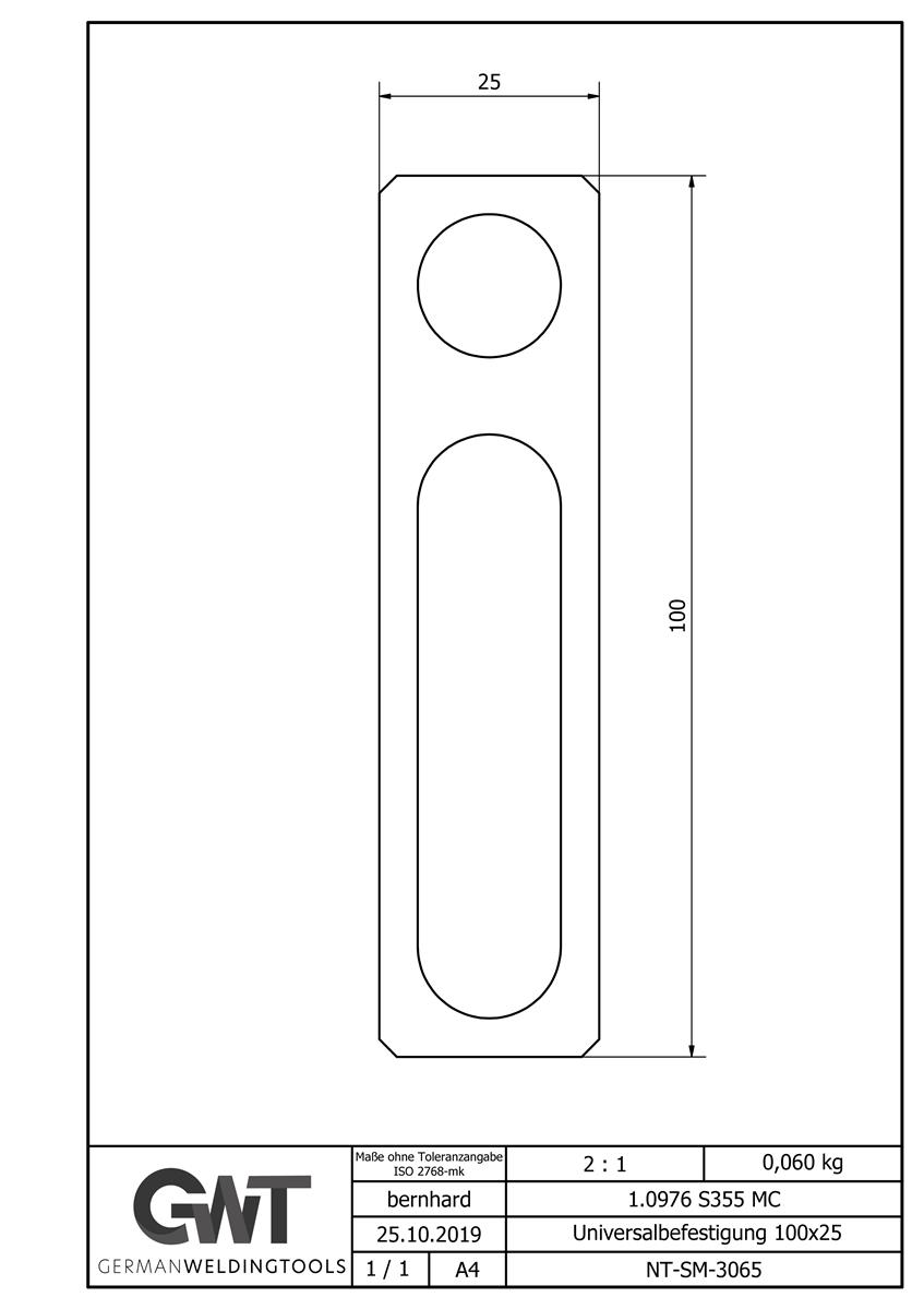 Mithilfe der Universalbefestigung in 100x25mm lassen sich Elemente, die Du bearbeiten möchtest, leicht auf dem Schweißtisch positionieren. Als Anschlag für rechtwinklige Rahmen lässt sich dieses Spannelement an den Seiten des Tischs anbringen. So bist Du sofort einsatzbereit. Klein, günstig und ein muss an jeden System 16 Lochtisch