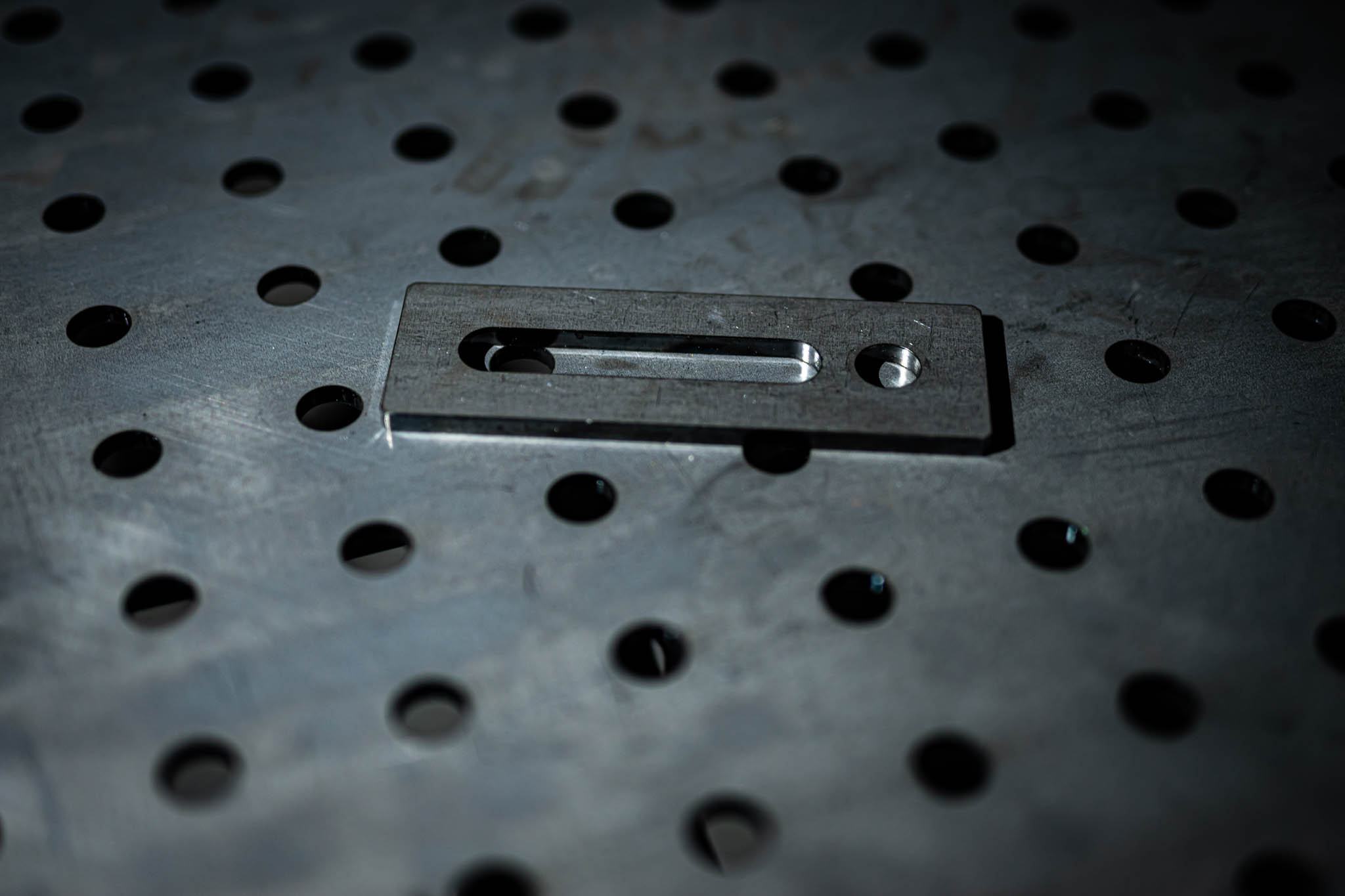 Mithilfe der 150x50mm Universalbefestigung lassen sich Elemente, die Du bearbeiten möchtest, leicht auf dem Schweißtisch positionieren. Als Anschlag für rechtwinklige Rahmen lässt sich dieses Spannelement an den Seiten des Tischs anbringen.