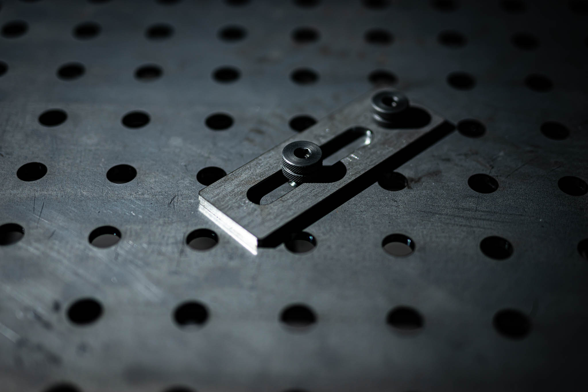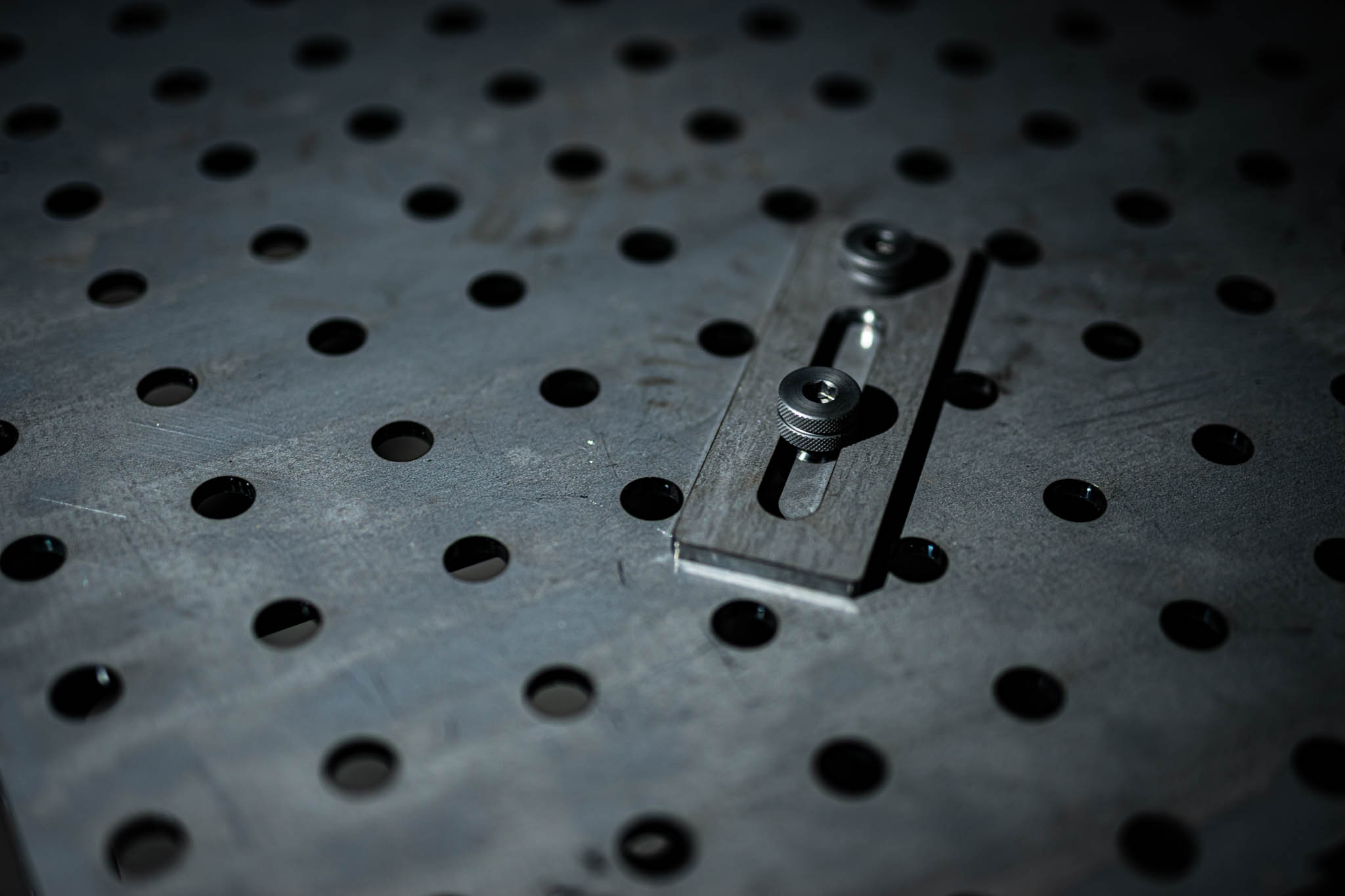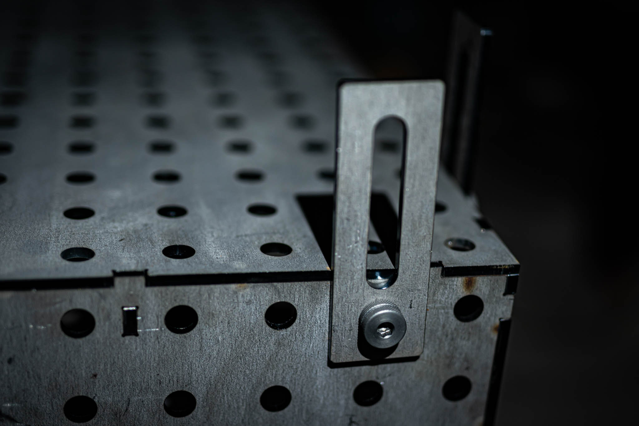 Mithilfe der Universalbefestigung lassen sich Elemente, die Du bearbeiten möchtest, leicht auf dem Schweißtisch positionieren. Als Anschlag für rechtwinklige Rahmen lässt sich dieses Spannelement an den Seiten des Tischs anbringen. So bist Du sofort einsatzbereit.