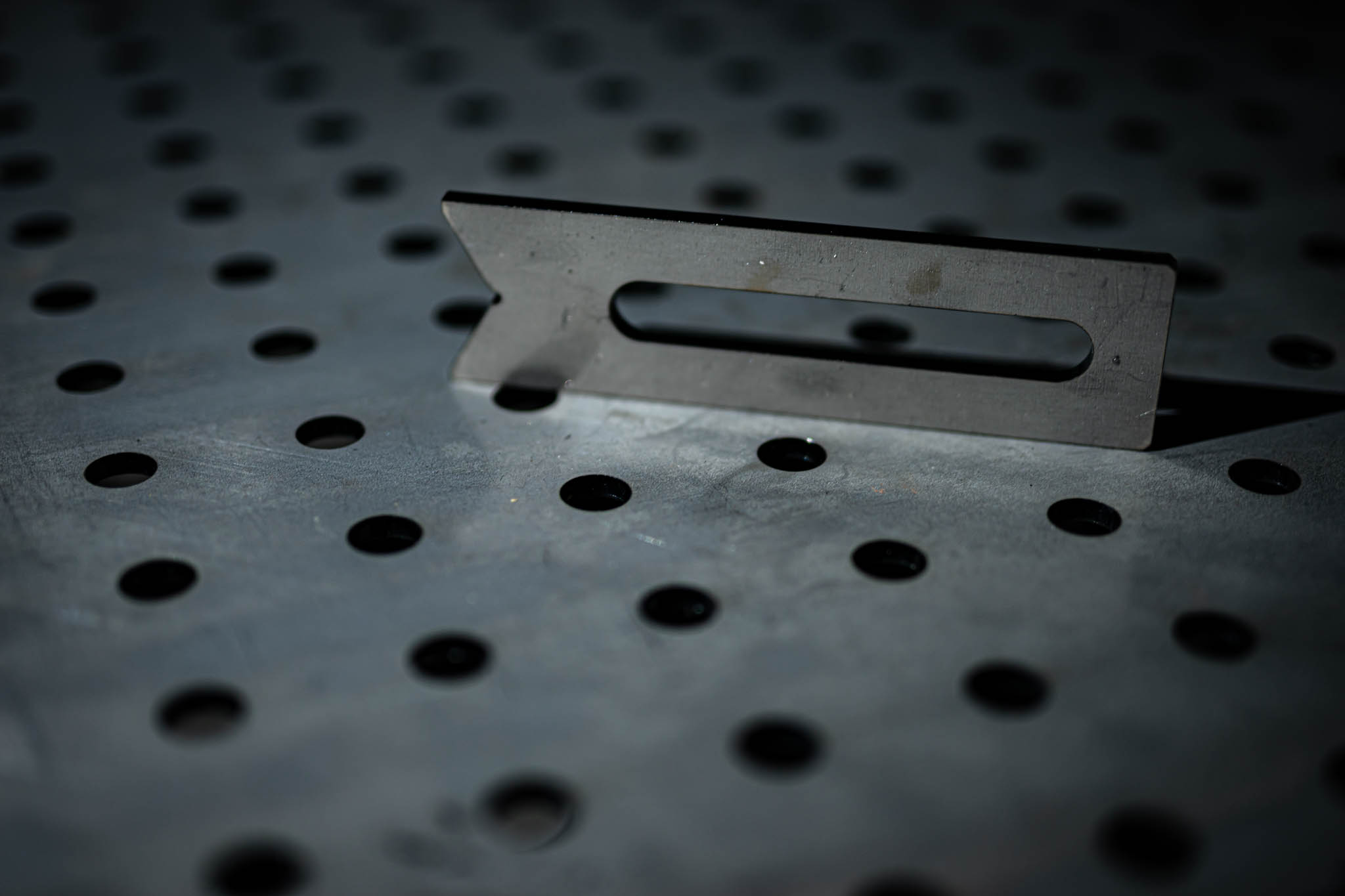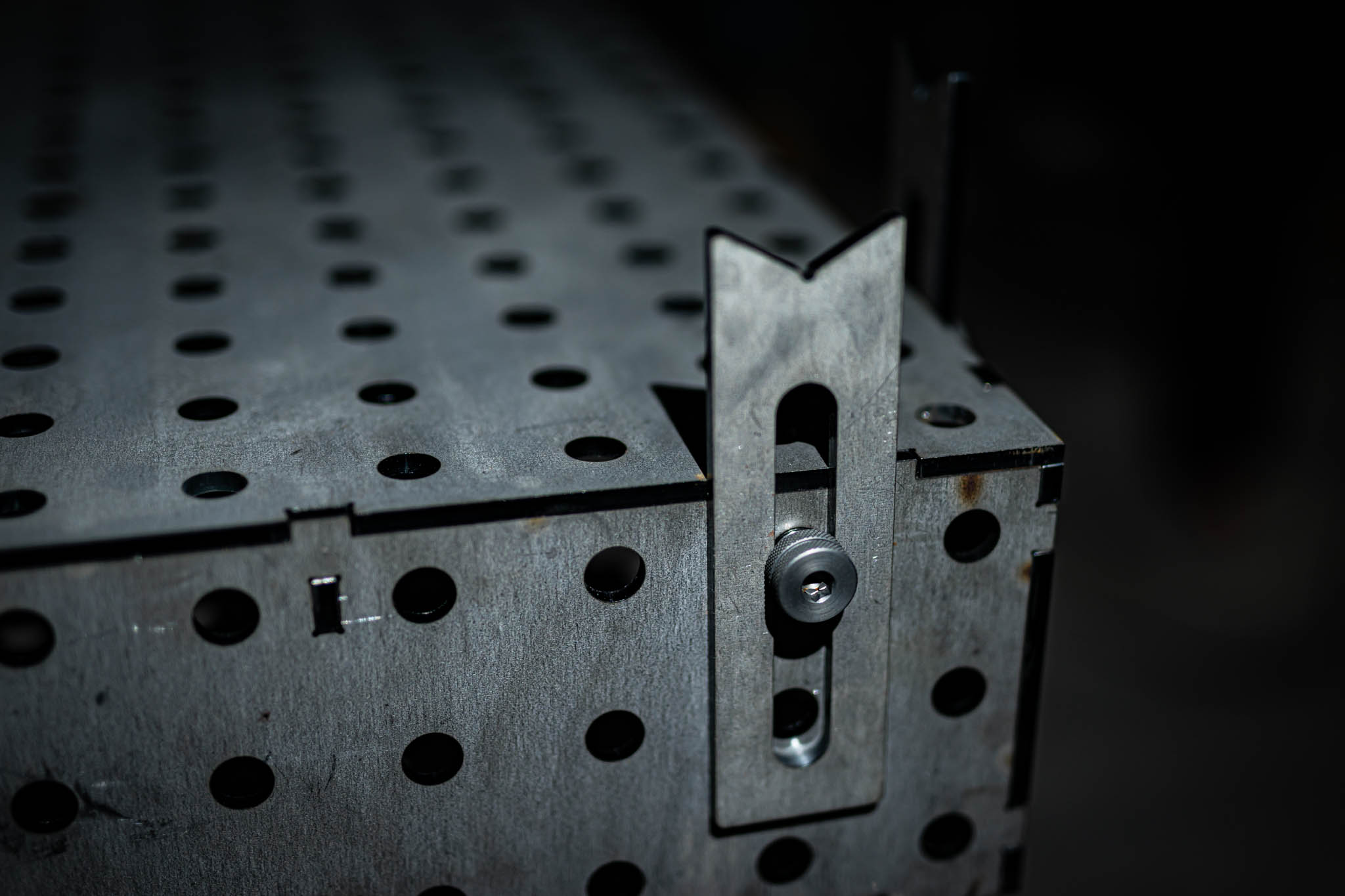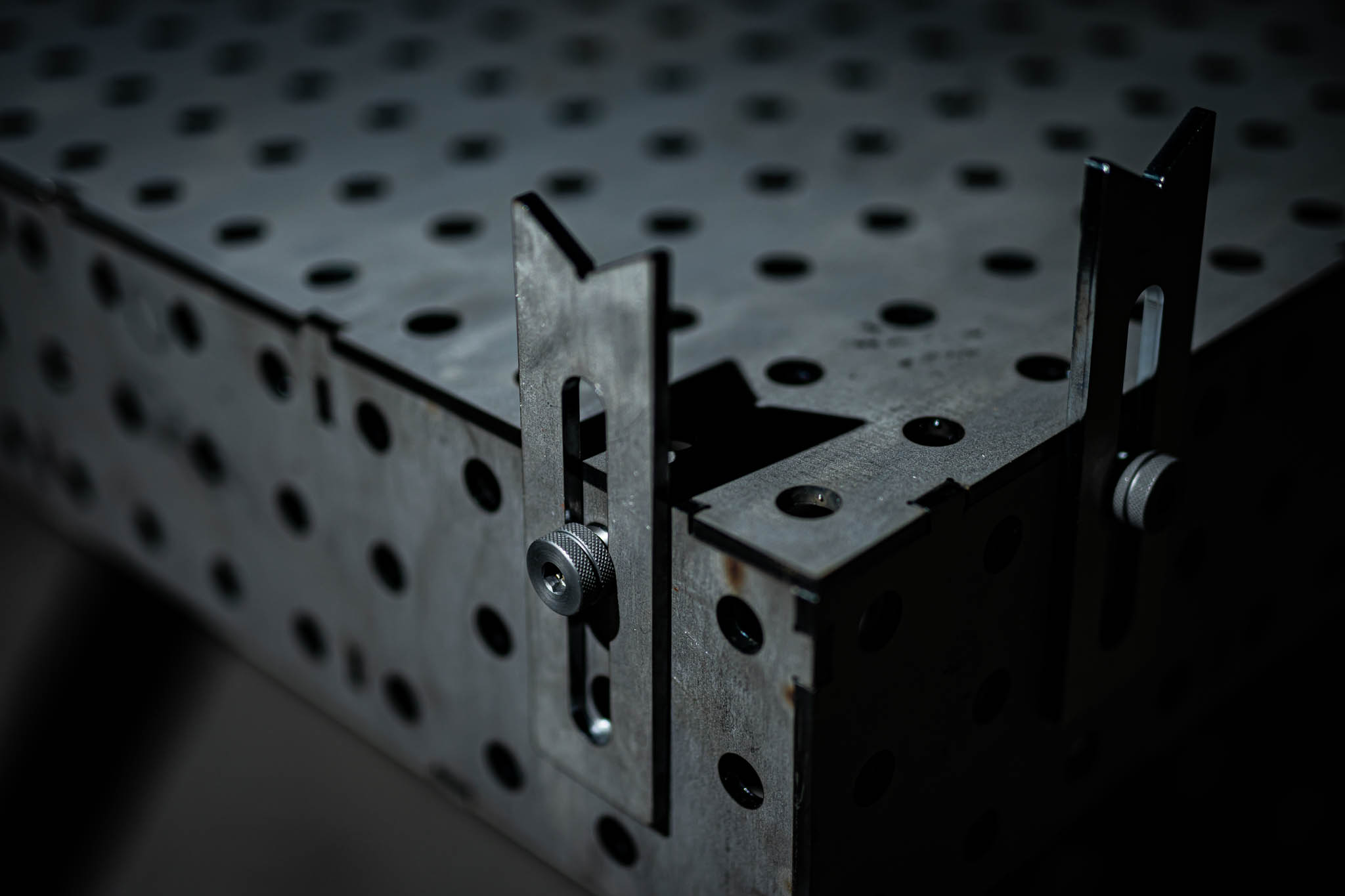 Mithilfe der Universalbefestigung lassen sich Elemente, die Du bearbeiten möchtest, leicht auf dem Schweißtisch positionieren. Als Anschlag für rechtwinklige Rahmen lässt sich dieses Spannelement an den Seiten des Tischs anbringen. So bist Du sofort einsatzbereit.