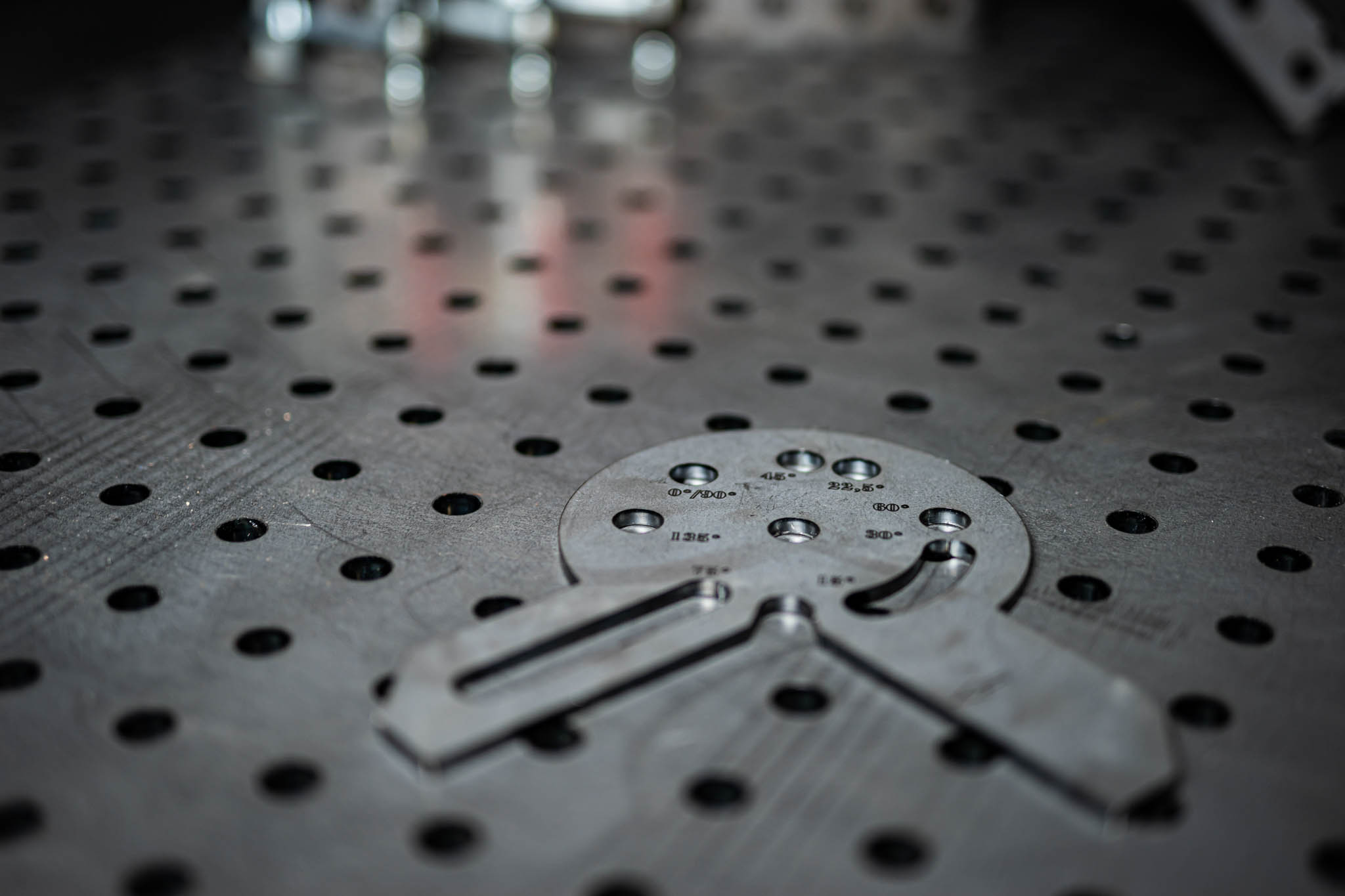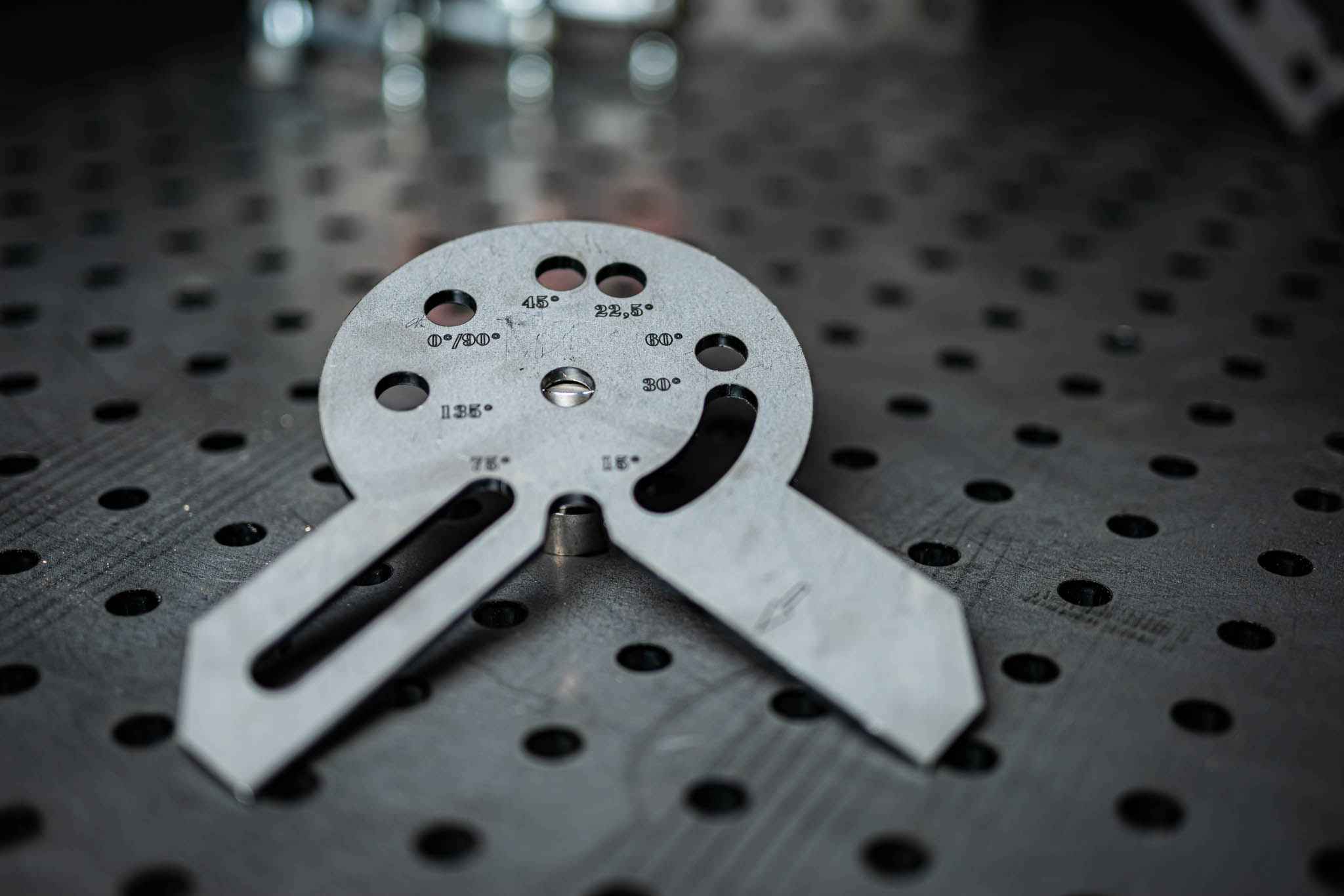Damit dein Endergebnis eckig wird: Den Anschlagwinkel fixierst du auf Deinem Schweißtisch mit dem Loch in der Mitte. Dann stellst du über die Skala und eine weiteres Loch in deinem Schweißtisch den gewünschten Winkel für dein Projekt ein. Du kannst dein Werkstück anlegen oder zwei Werkstücke im rechten Winkel. Damit hast Du zusätzlich immer schnell einen zuverlässig eingestellten 90° Winkel zur Hand.