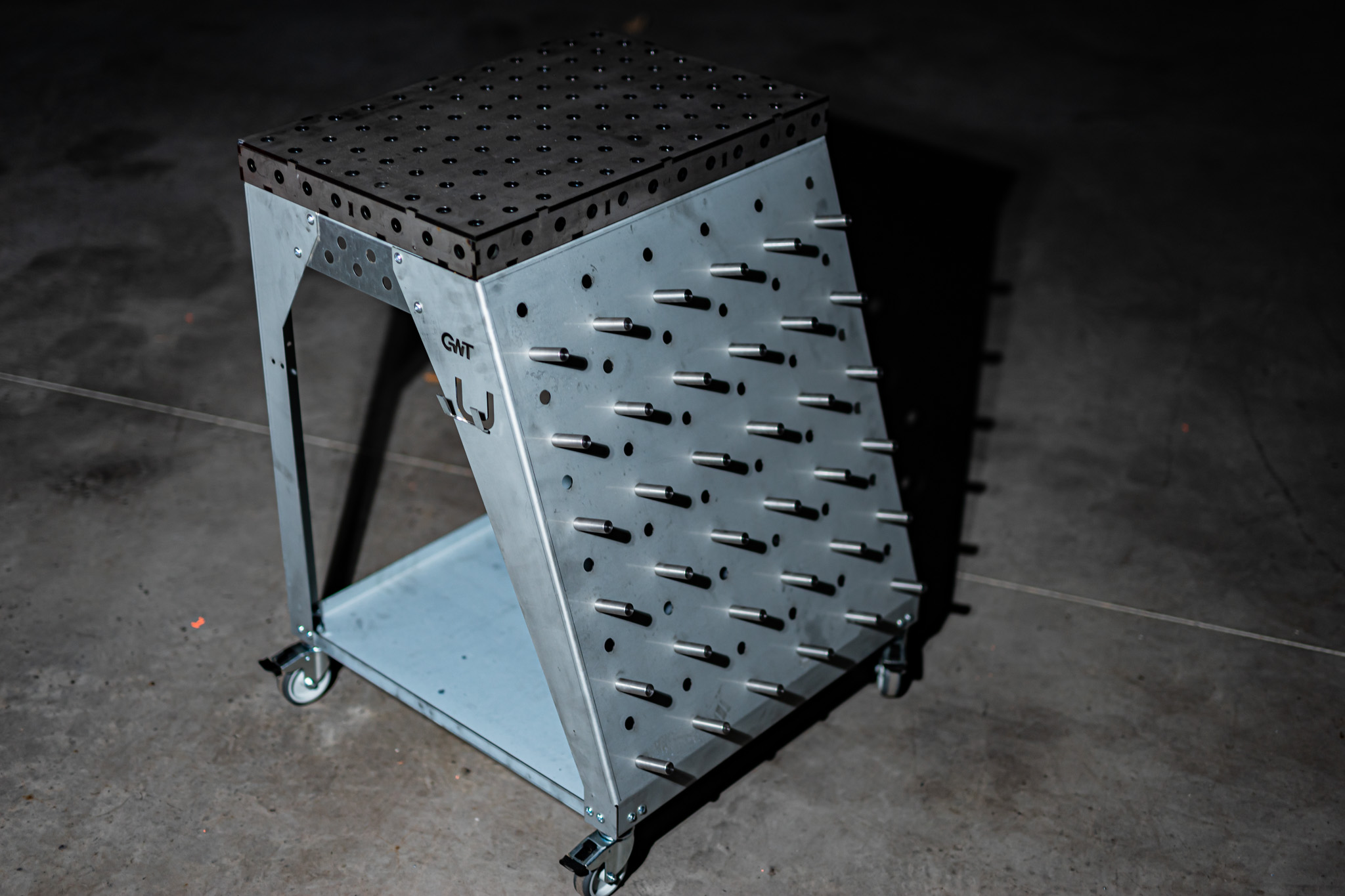 Die Toolrack Workstation dient zur Aufbewahrung von Zubehör, Kleinteilen und ebenso als mobiler Arbeitsplatz. Mit den Grundmaßen von 600x600mm und einer Zusatzlichen Arbeitsfläche in Form eines Lochtisches mit 600x400mm könnt ich auch Kleinteile darauf schweißen, spannen oder bearbeiten. Die Arbeitshöhe beträgt 800mm, verwendet wird das gängige System 16 mit 50mm Raster. Seiltlich könnt ihr entweder euren Schweißhelm dran hängen oder gegebenenfalls den WIG-Brenner.