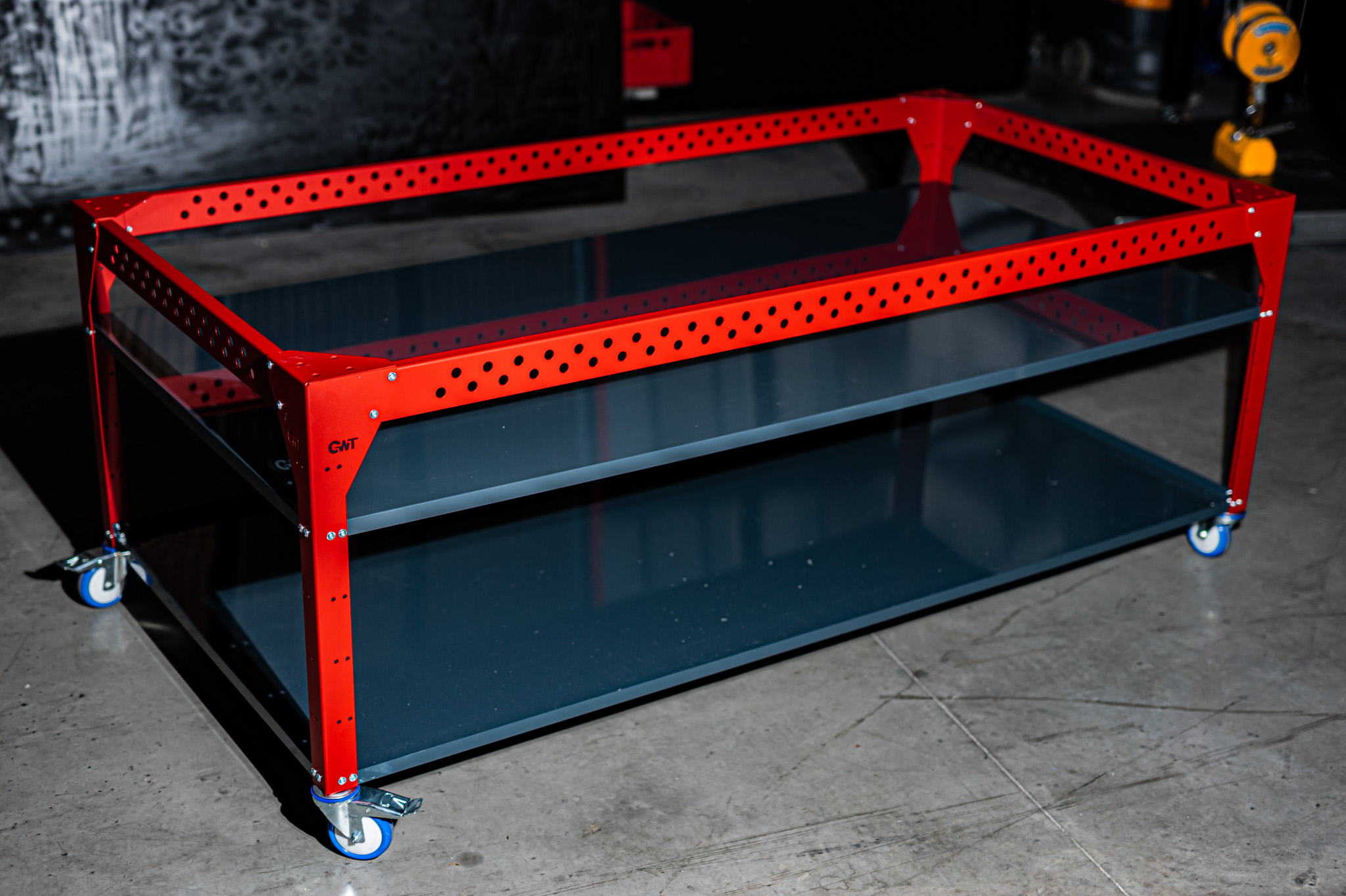 Mit der Zwischenablage könnt ihr alles nötige unter dem Tisch verstauen und habt dank der Rollen so einen mobilen Arbeitsplatz.