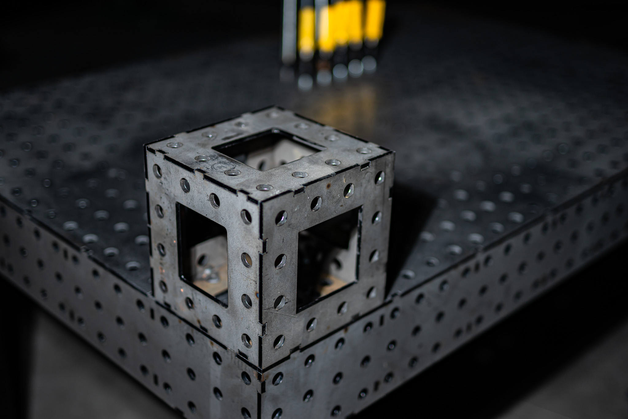 Der Würfel eignet sich ideal zur Verarbeitung von Profilbauteilen. Wenn Du dein Objekt positionieren willst, kannst Du ihn als „Unterbau” verwenden und dort zum Beispiel die Rohrmatrize aufspannen. Der Würfel gibt so Hilfestellung beim sauberen befestigen und bearbeiten von Profilen.