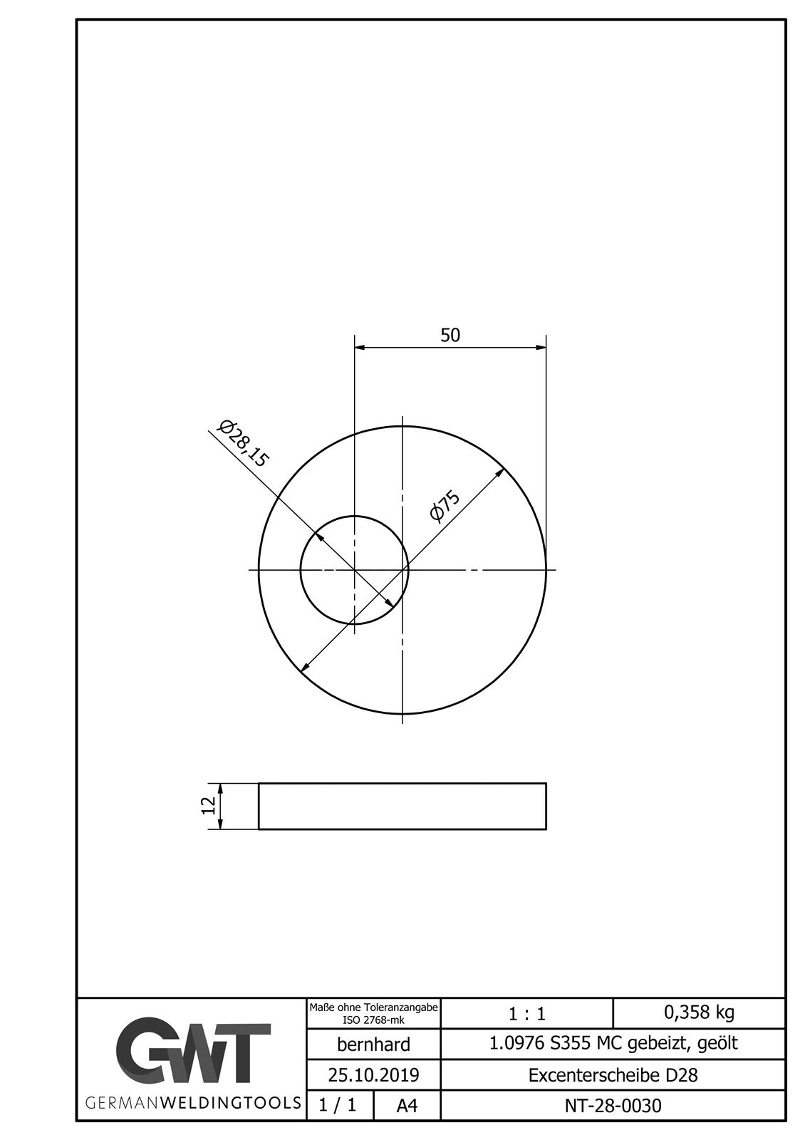 Die Excenterscheibe hilft Dir bei der Positionierung deines Werkstücks zwischen den Maßen des Lochrasters. Der flache Anschlag mit Kurvenscheibe zum einstellen des Abstands hilft Dir deine Werkstücke vor dem Schweißen exakt zu fixieren. NT-28-0030 Excenterscheibe D28 Plattenstärke 12 mm Material 1.0038/S235