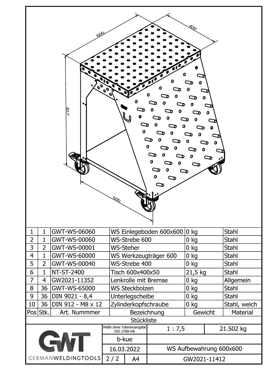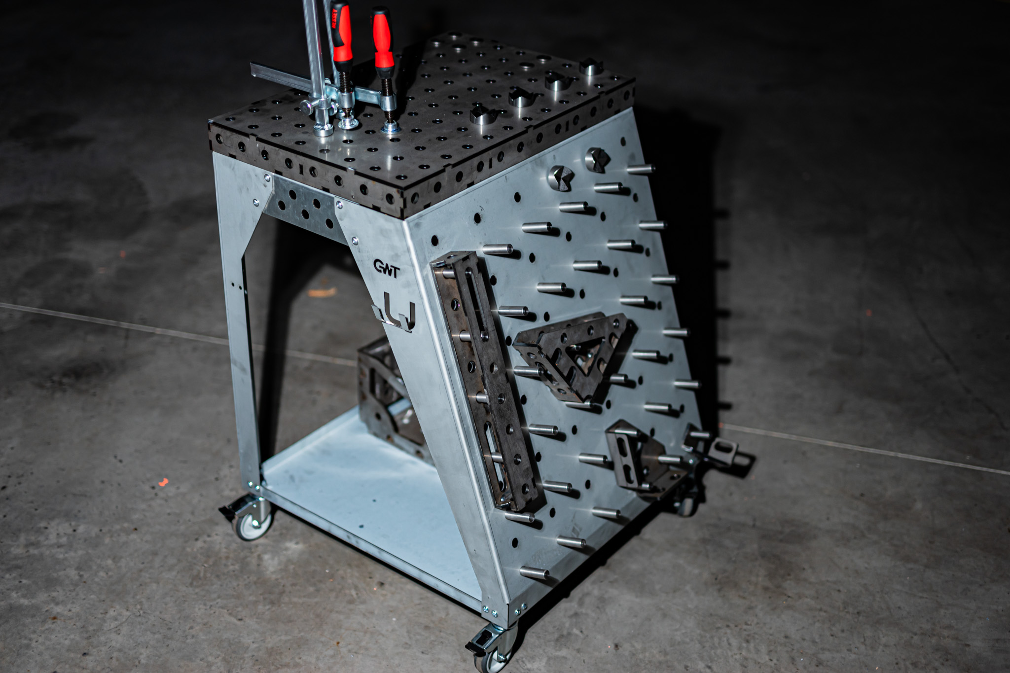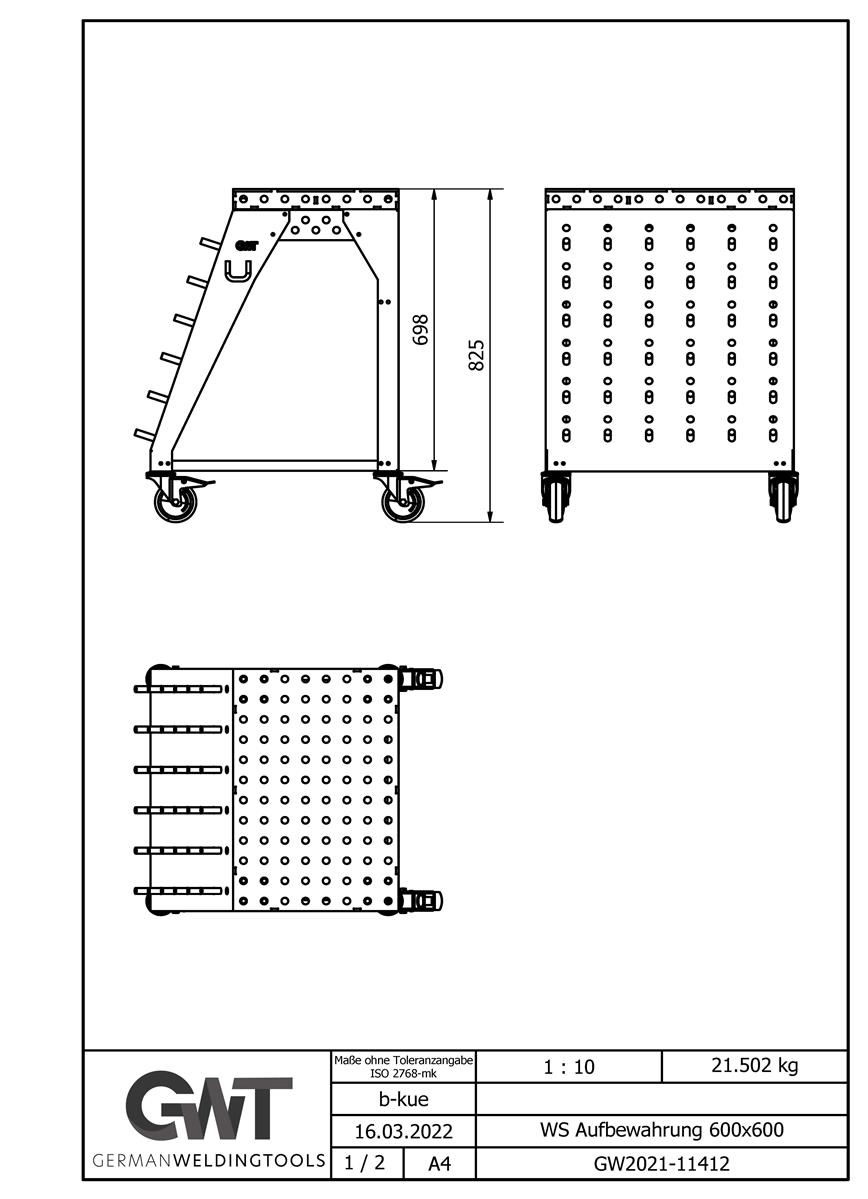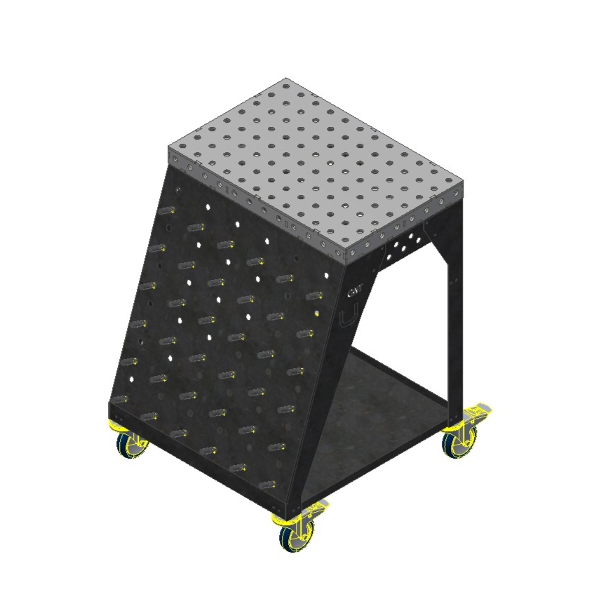 Die Toolrack Workstation dient zur Aufbewahrung von Zubehör, Kleinteilen und ebenso als mobiler Arbeitsplatz. Mit den Grundmaßen von 600x600mm und einer Zusatzlichen Arbeitsfläche in Form eines Lochtisches mit 600x400mm könnt ich auch Kleinteile darauf schweißen, spannen oder bearbeiten. Verwendet wird das gängige System 28mm 100 mm Raster. Seiltlich könnt ihr entweder euren Schweißhelm dran hängen oder gegebenenfalls den WIG-Brenner.