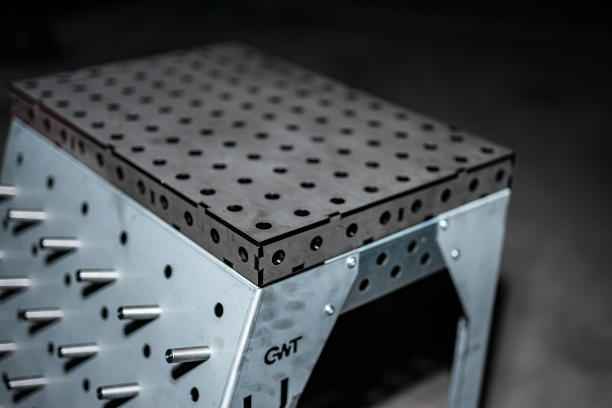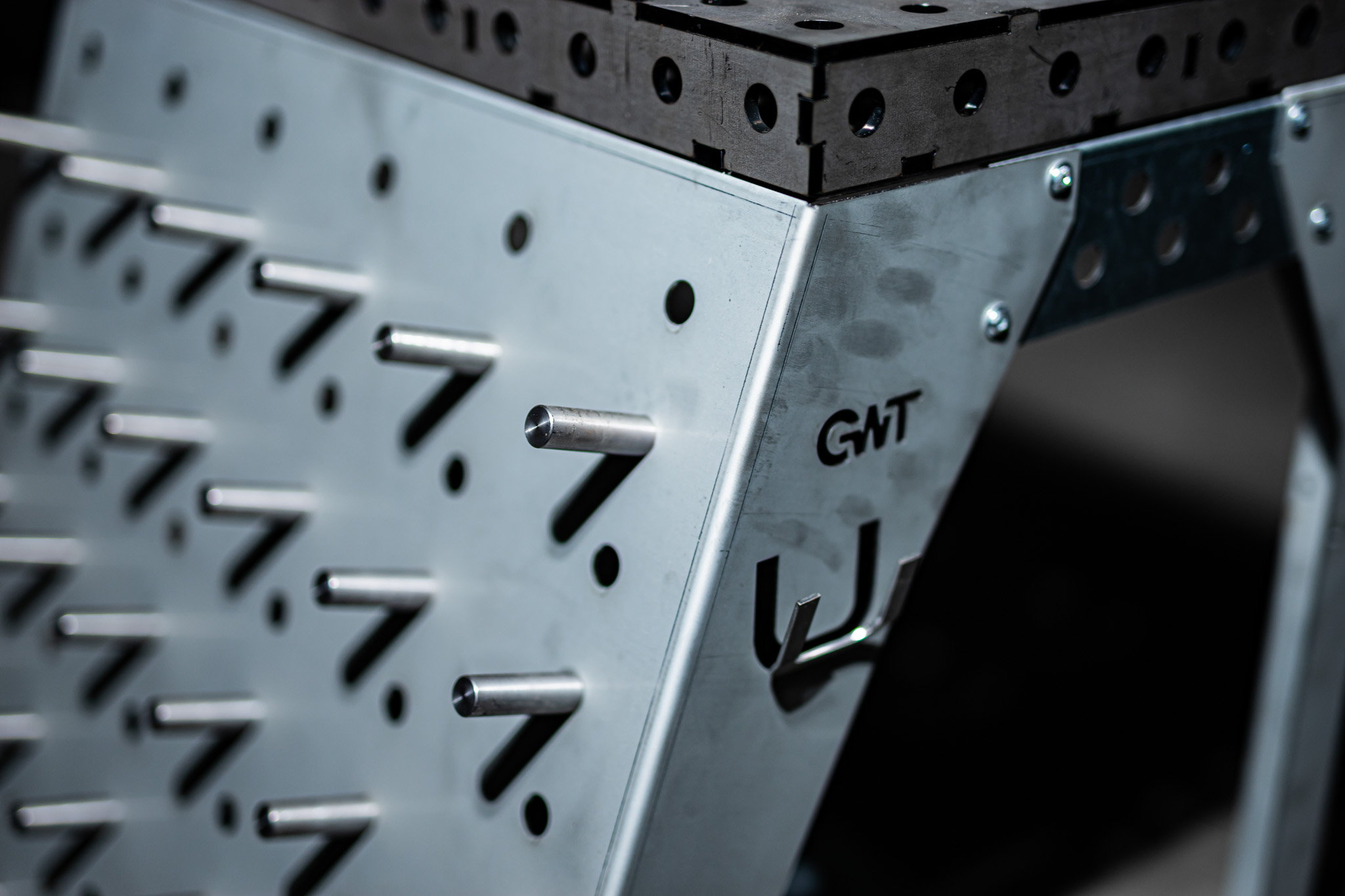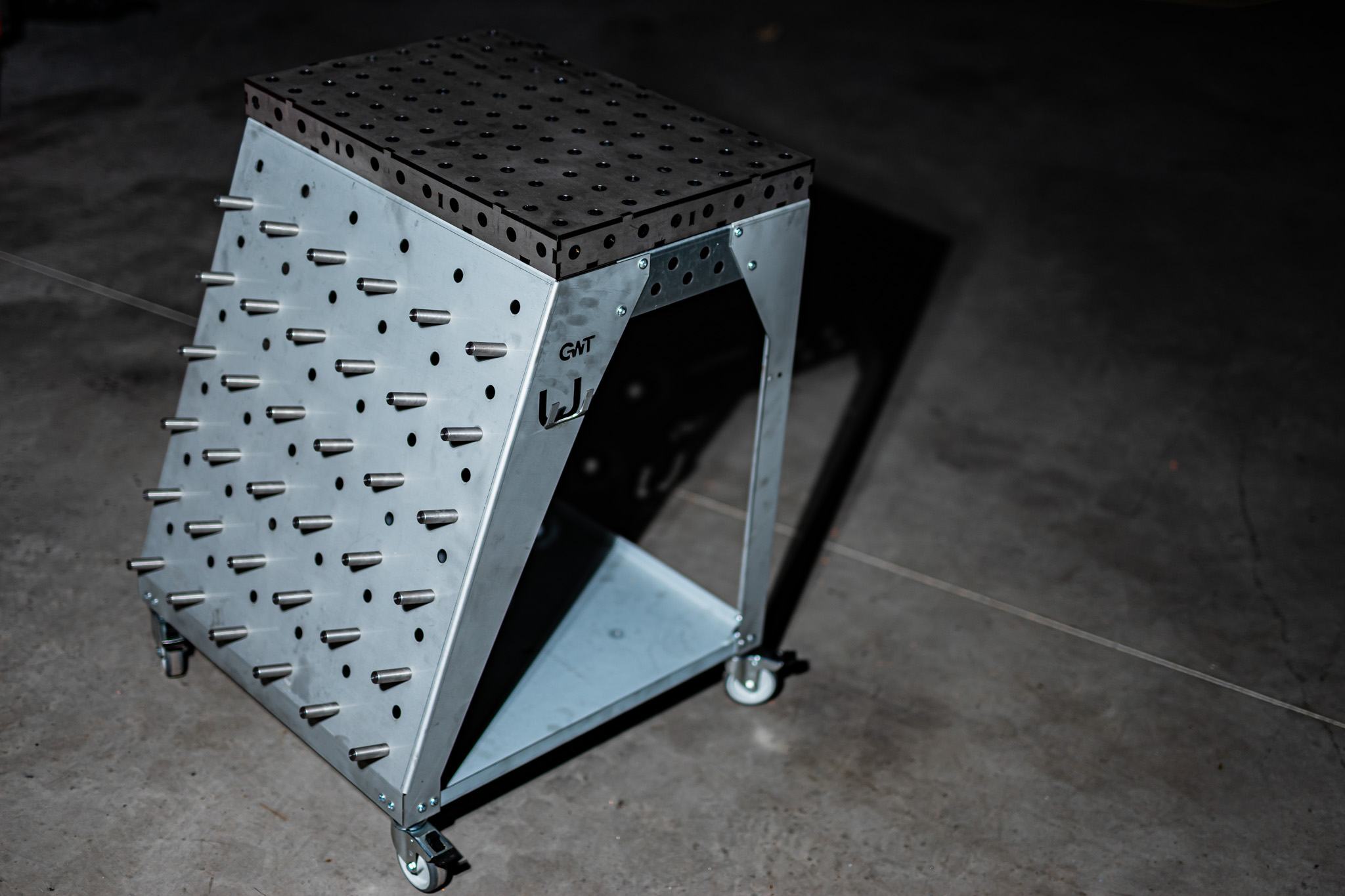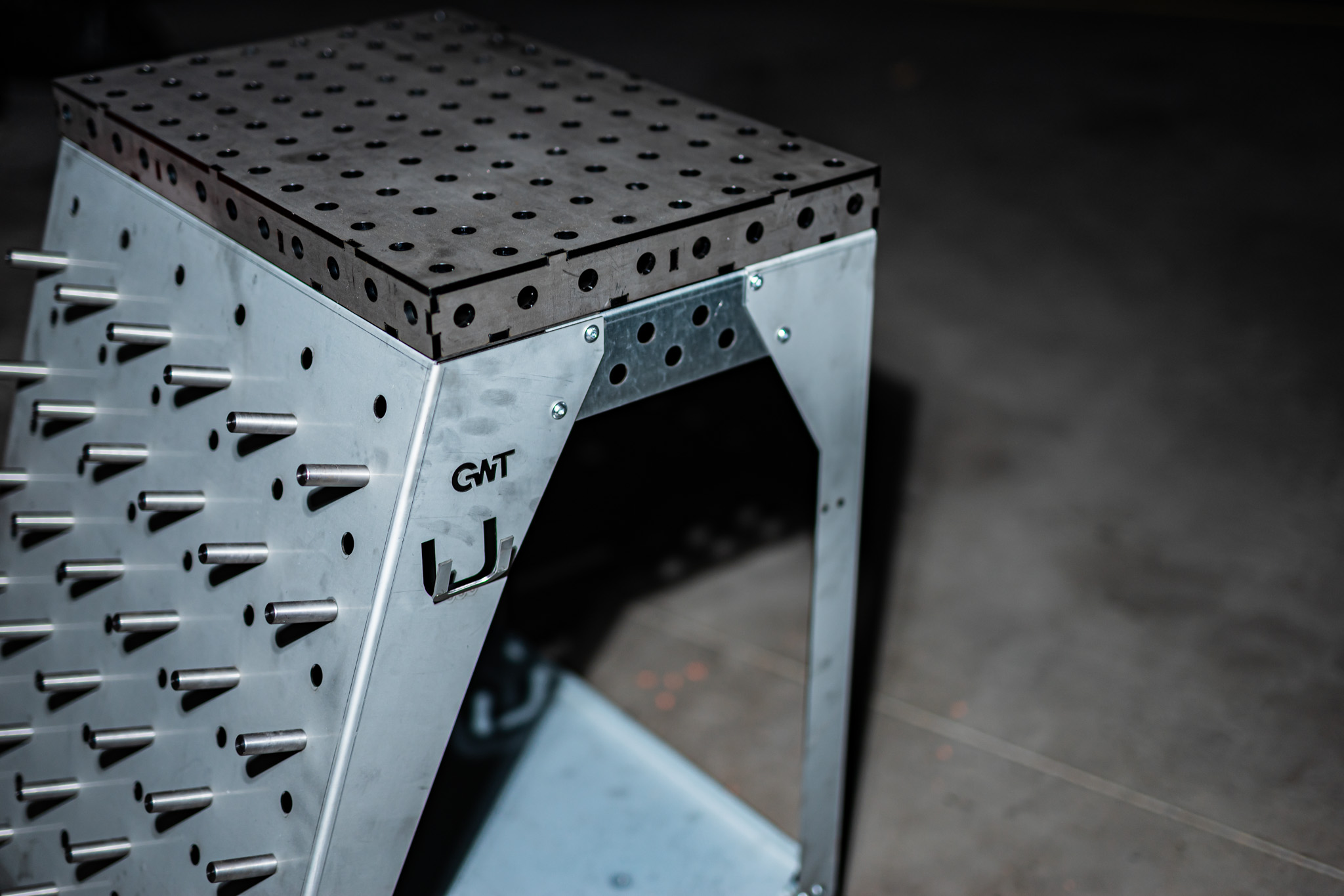 Die Toolrack Workstation dient zur Aufbewahrung von Zubehör, Kleinteilen und ebenso als mobiler Arbeitsplatz. Mit den Grundmaßen von 600x600mm und einer Zusatzlichen Arbeitsfläche in Form eines Lochtisches mit 600x400mm könnt ich auch Kleinteile darauf schweißen, spannen oder bearbeiten. Verwendet wird das gängige System 28mm 100 mm Raster. Seiltlich könnt ihr entweder euren Schweißhelm dran hängen oder gegebenenfalls den WIG-Brenner.