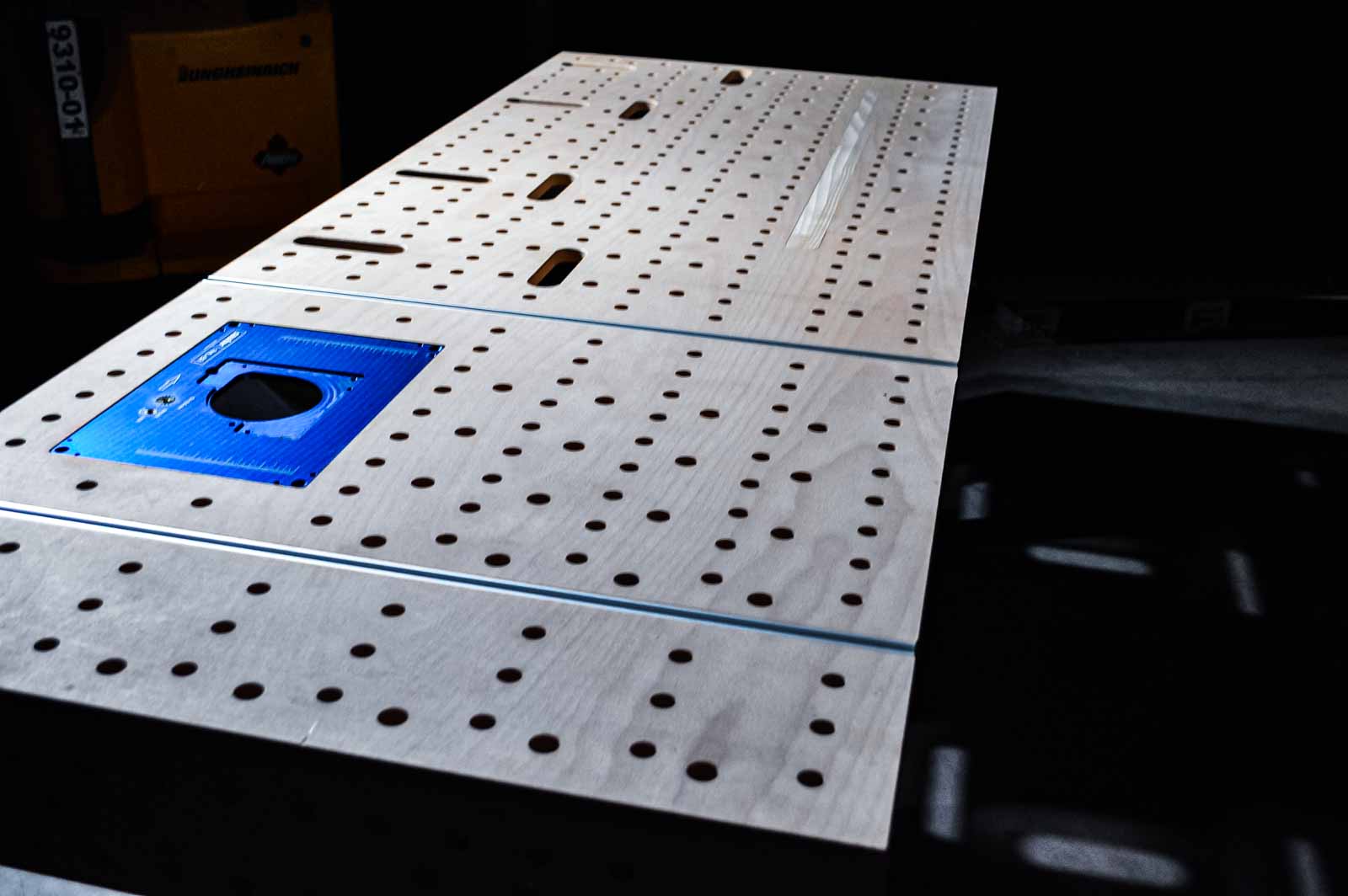 Mit diesem Mulitfunktionslochtisch könnt ihr normale Schraubzwingen, unsere System 16 Tools und Das Zubehör von Festool verwenden.